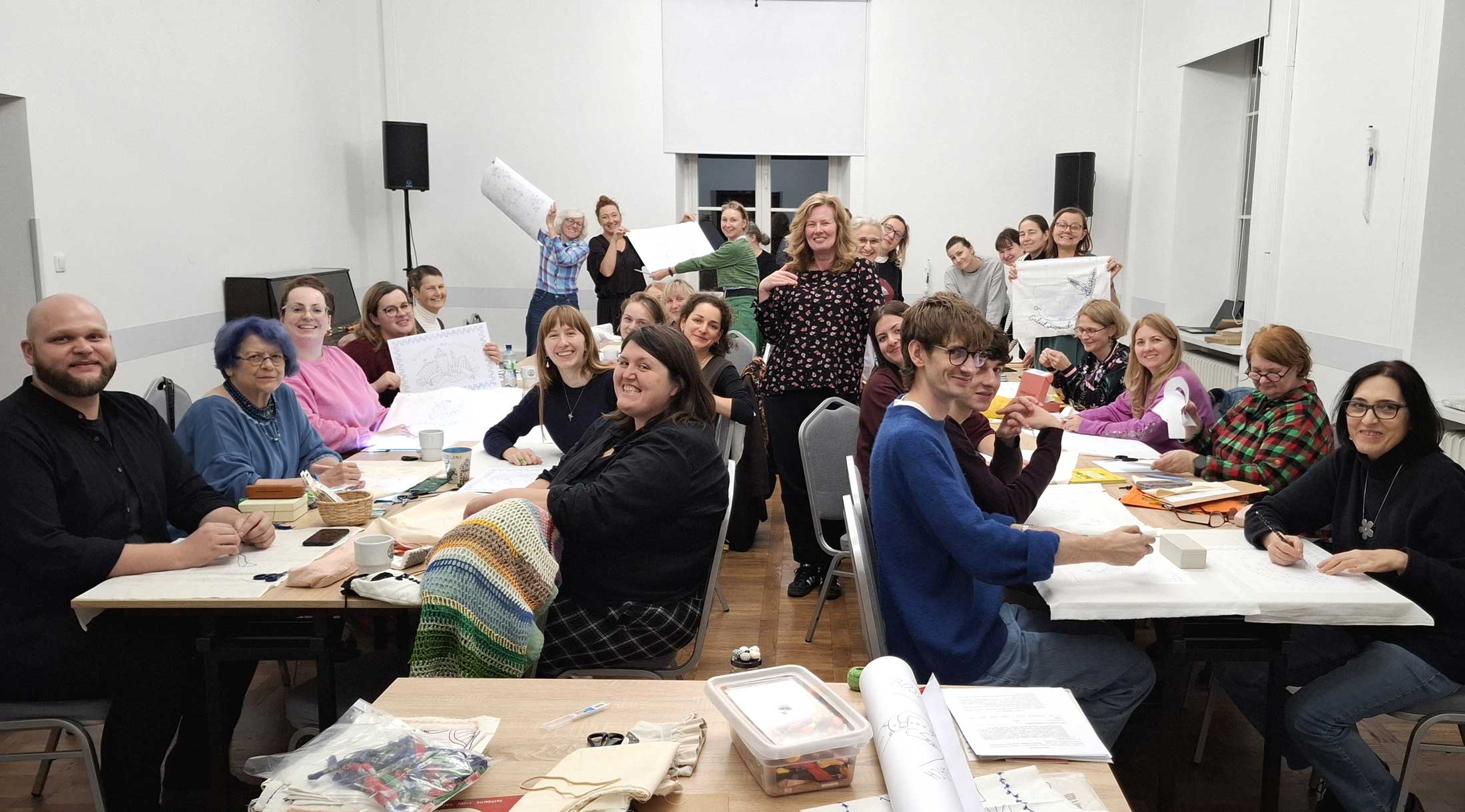 Oto grupa osób, która w poniedziałek 20 października 2025 roku rozpoczęła wspólne wyszywanie makatek kuchennych pisanych gwarą warszawską! 💙