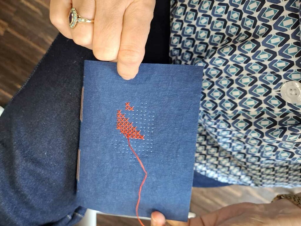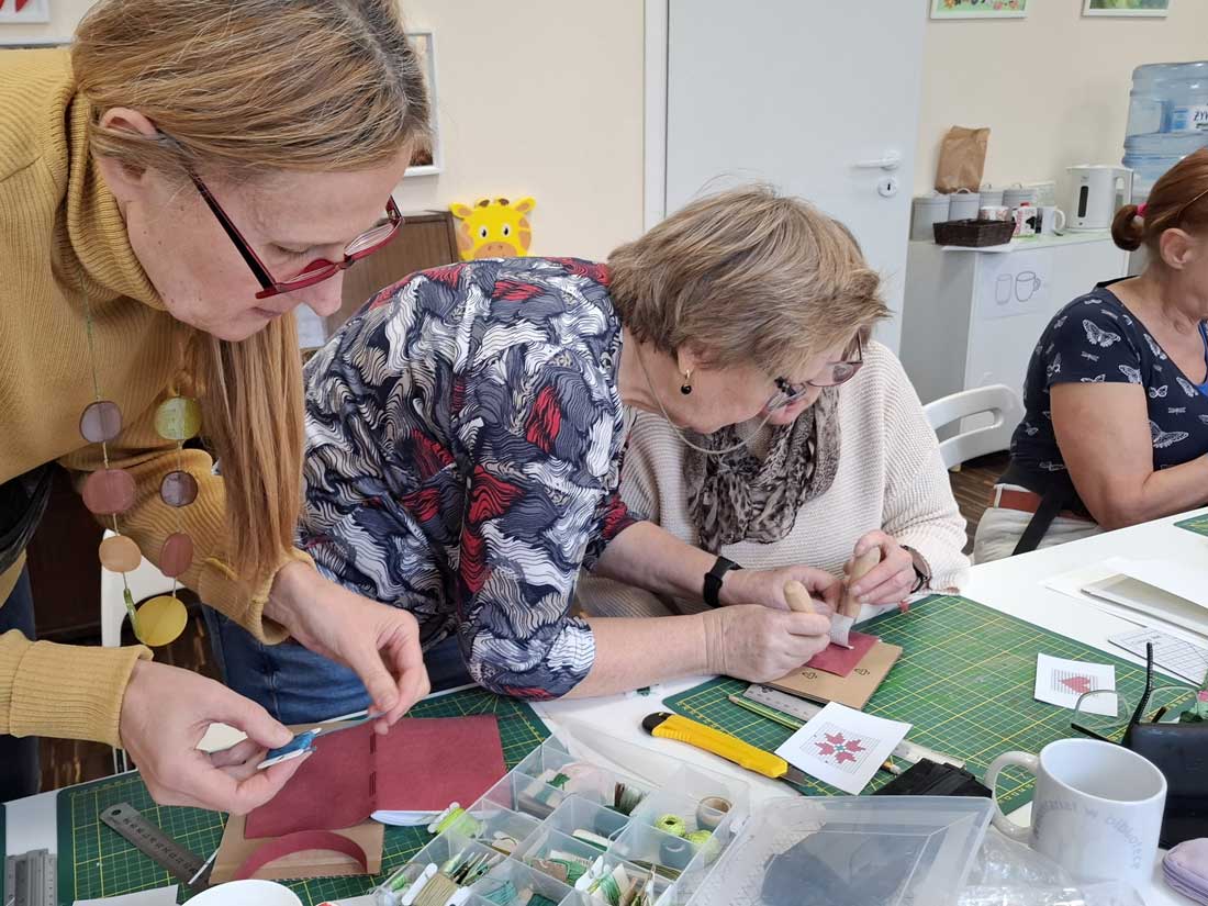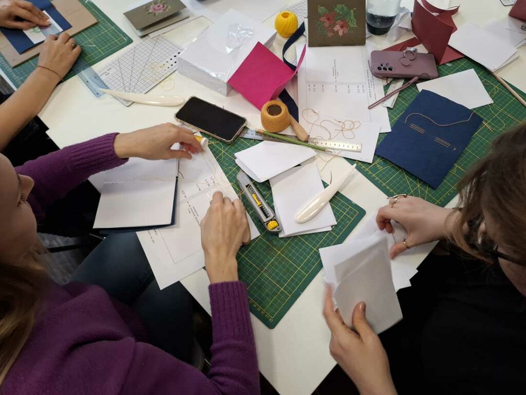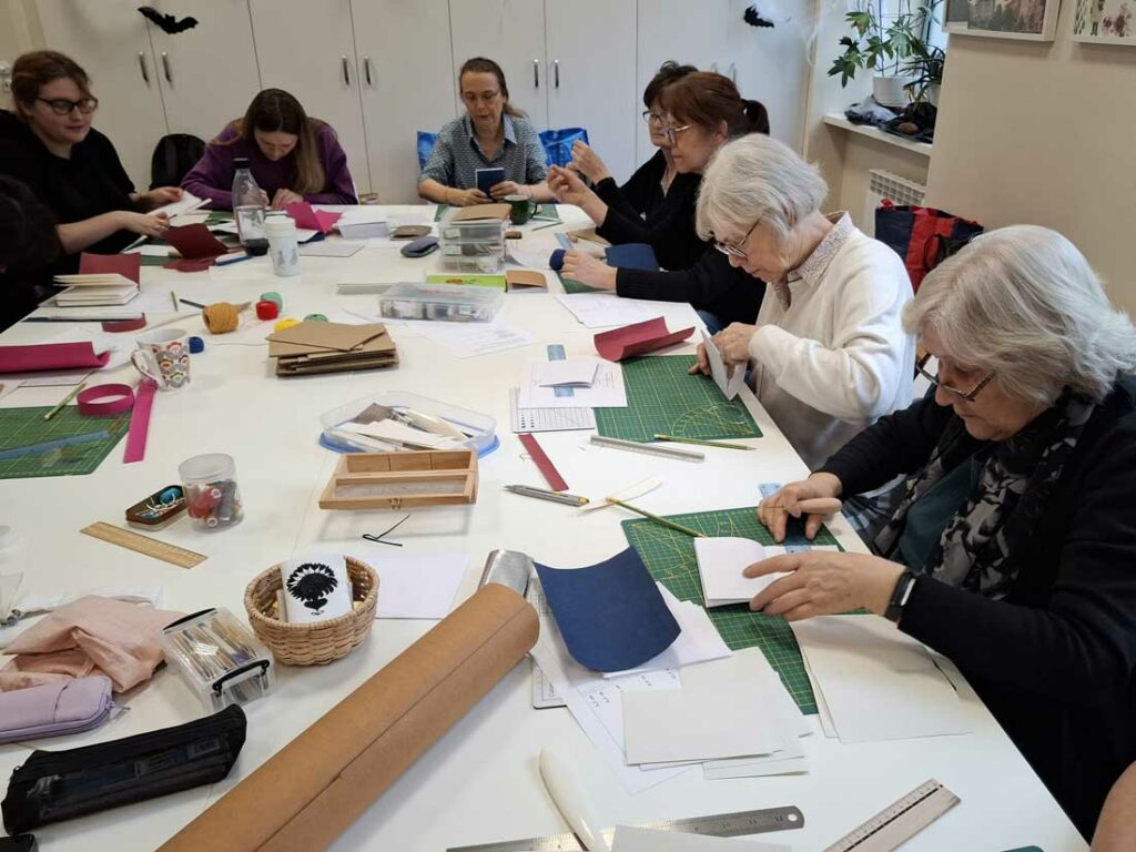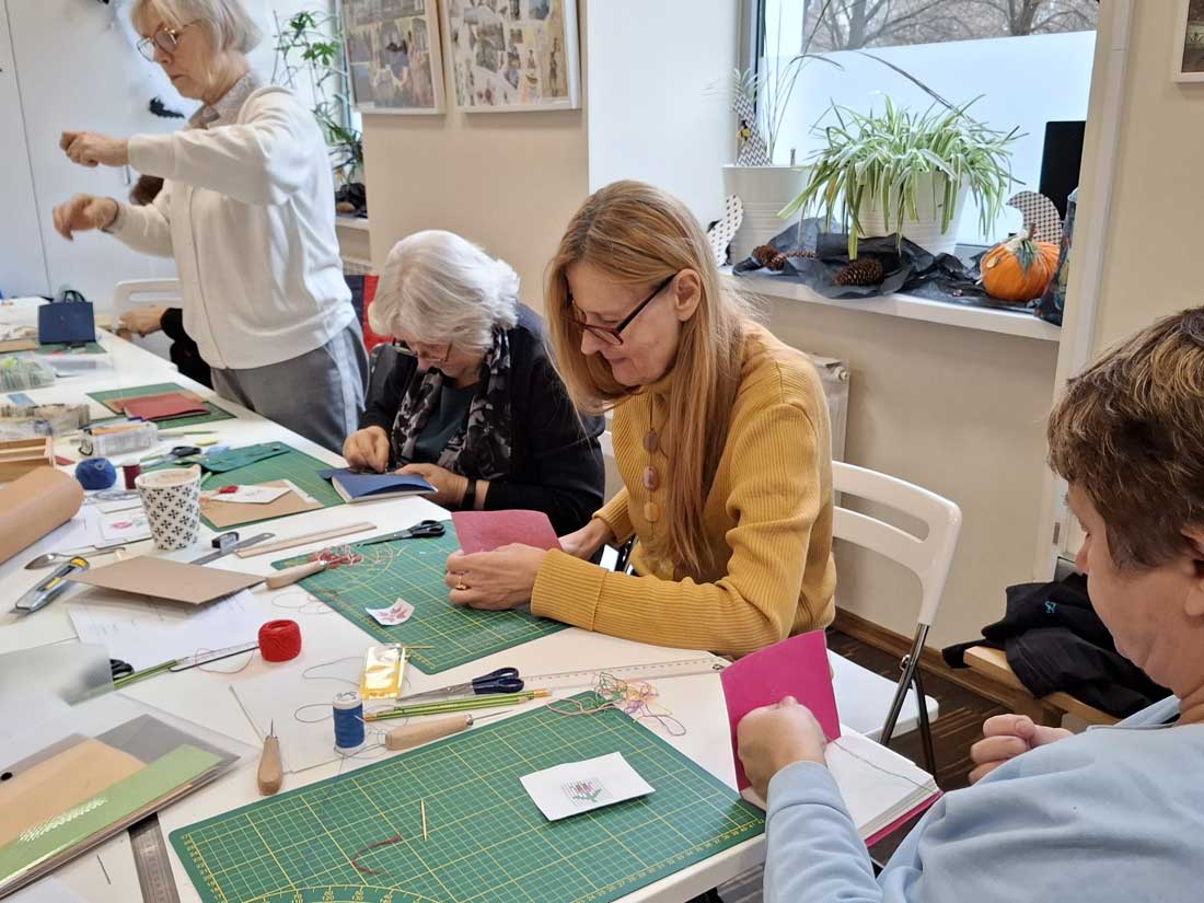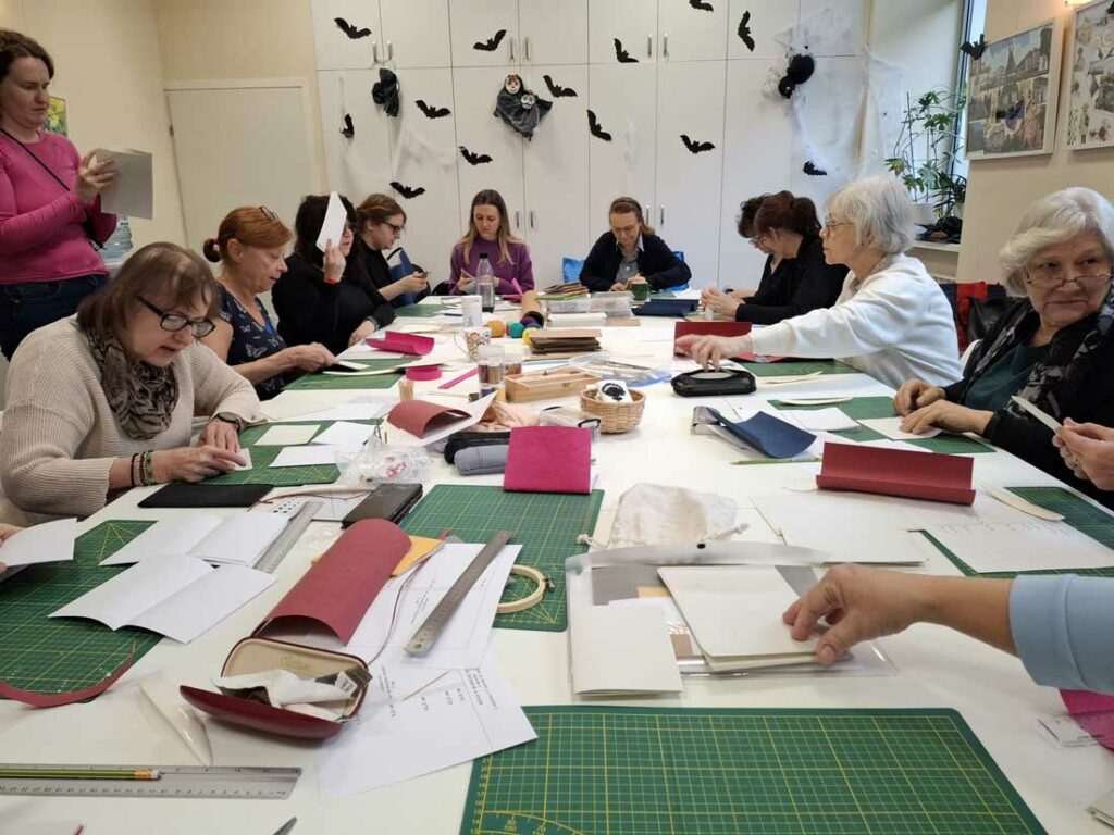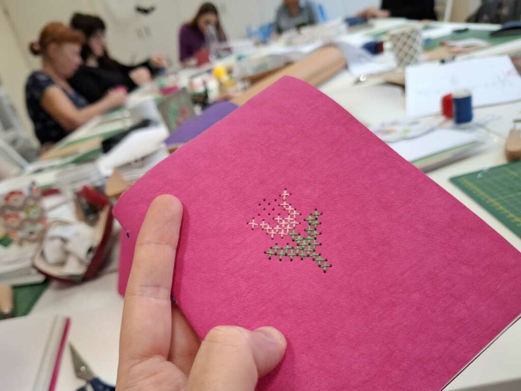 W dniu 17 listopada 2025 roku odbyły się warsztaty introligatorskie, podczas których uczestniczki tworzyły notesy z miękką okładką wyszywaną krzyżykami. Spotkanie było okazją do poznania podstaw szycia notesów oraz połączenia introligatorstwa z haftem, co dało niezwykle ciekawy i efektowny rezultat.