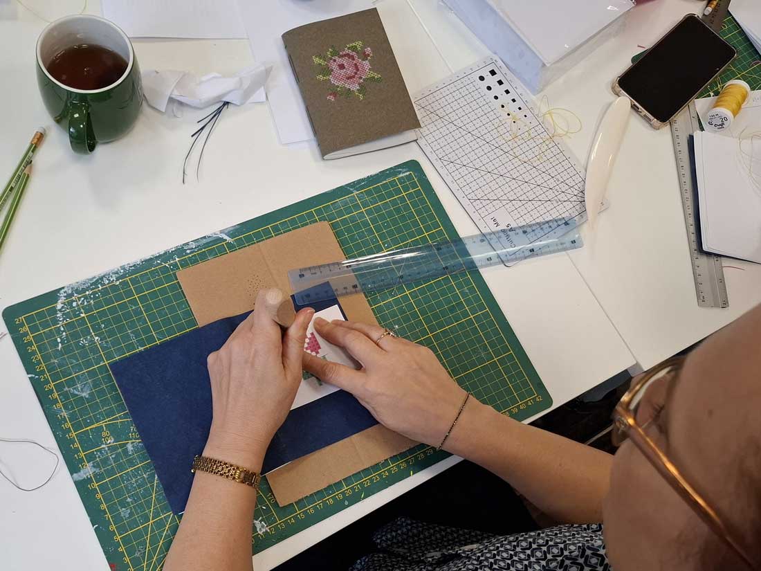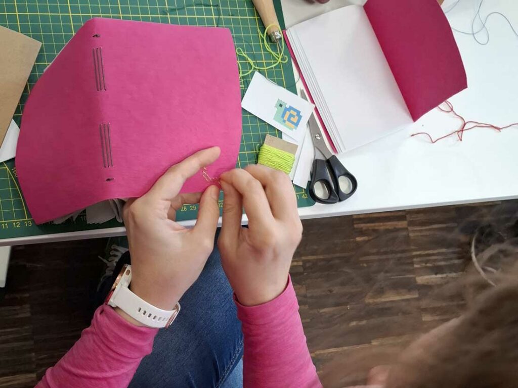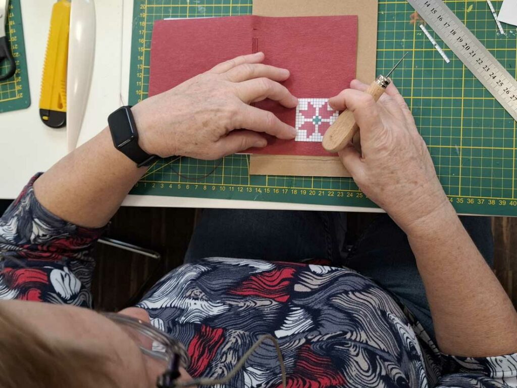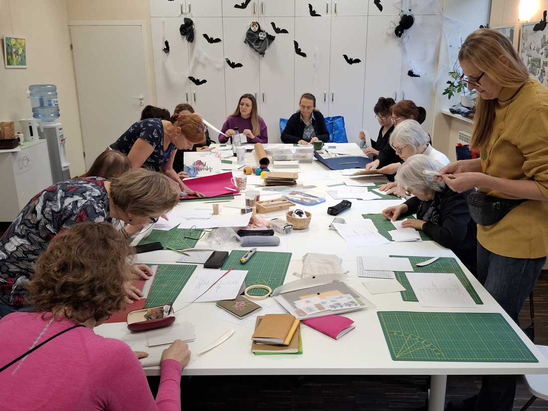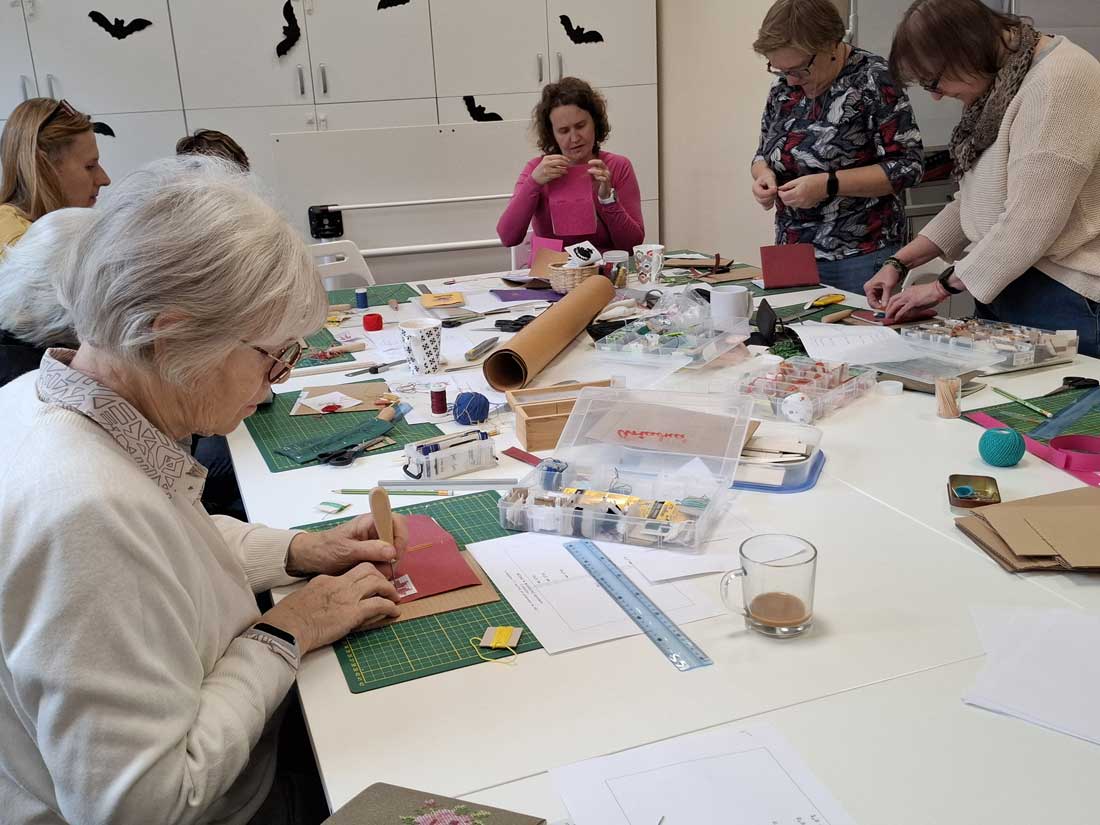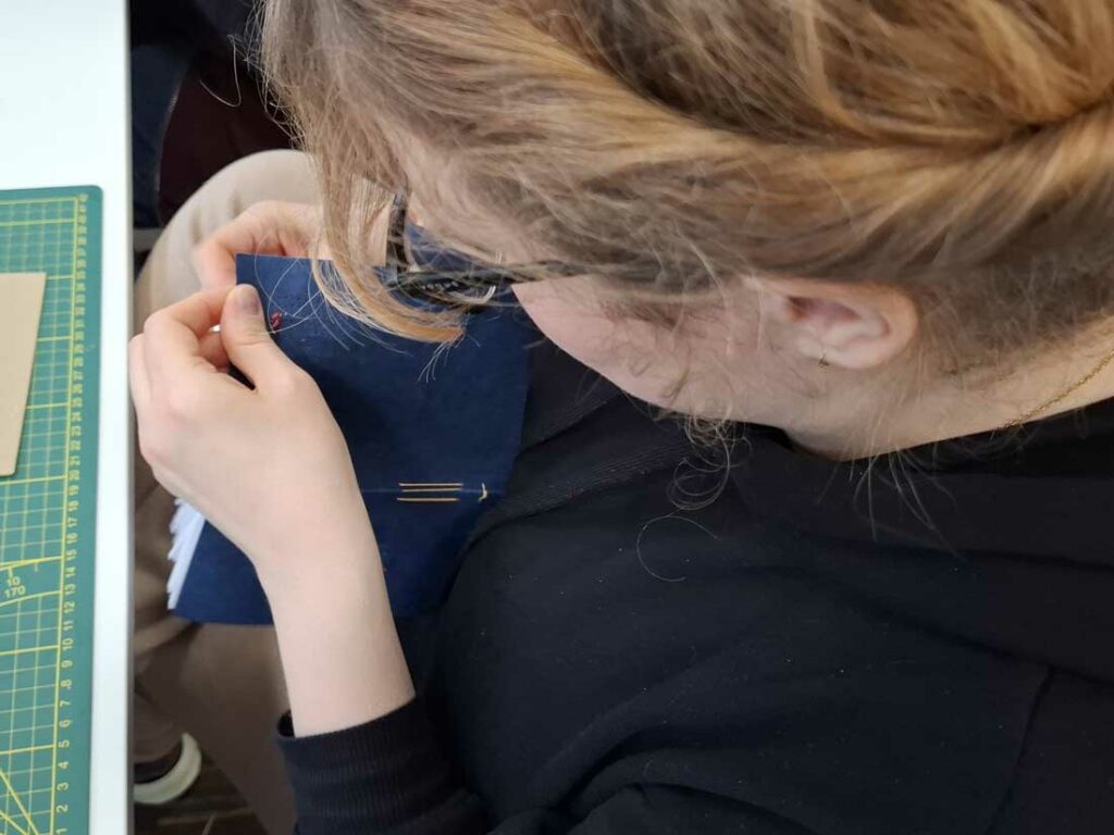 W dniu 17 listopada 2025 roku odbyły się warsztaty introligatorskie, podczas których uczestniczki tworzyły notesy z miękką okładką wyszywaną krzyżykami. Spotkanie było okazją do poznania podstaw szycia notesów oraz połączenia introligatorstwa z haftem, co dało niezwykle ciekawy i efektowny rezultat.