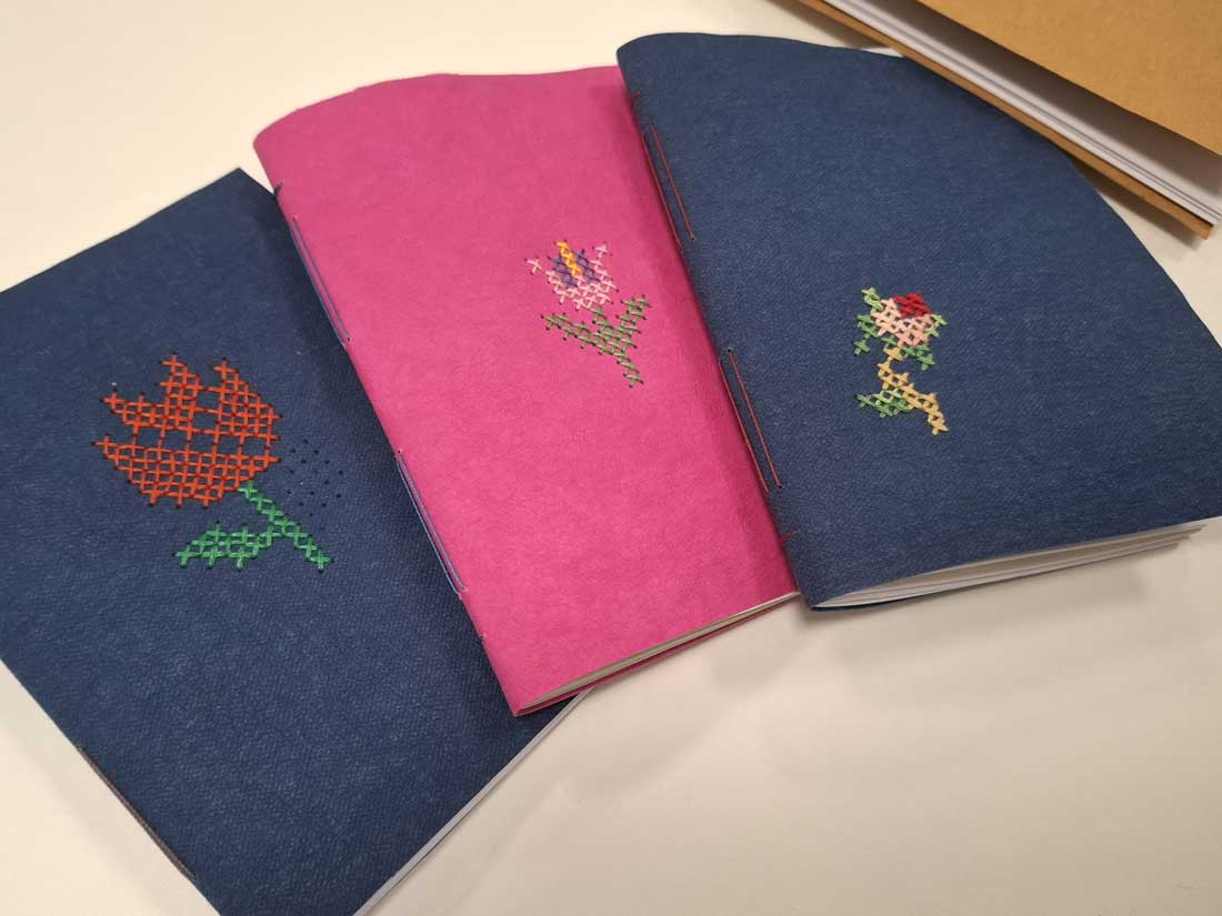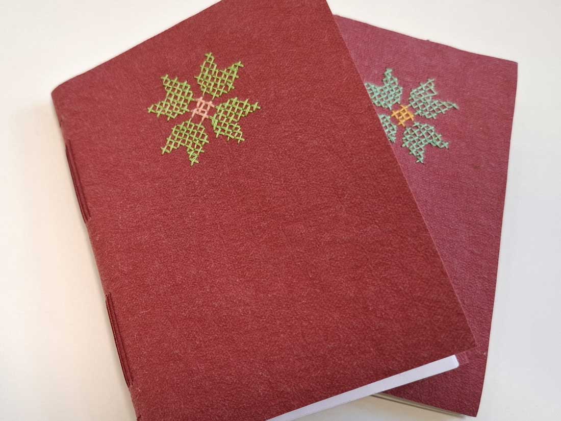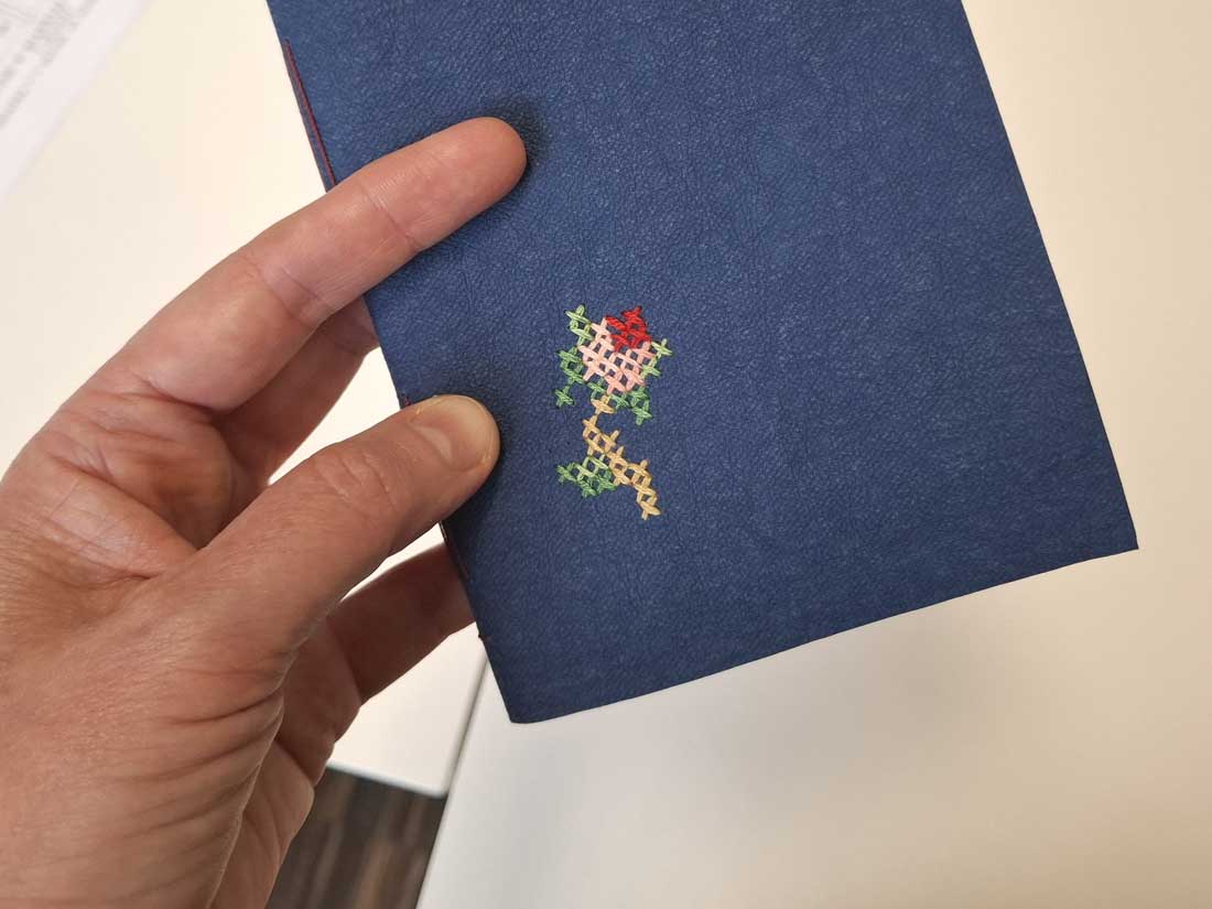 Okładki powstały z washpappy – nowoczesnego, ekologicznego materiału, który wyglądem przypomina papier, a właściwościami skórę. Washpappa jest lekka, trwała, odporna na zagniecenia i szycie, a jednocześnie przyjemna w dotyku, dzięki czemu doskonale sprawdza się jako materiał na okładki notesów i projekty rękodzielnicze. Haft krzyżykowy pięknie podkreślił jej strukturę i dodał notesom indywidualnego charakteru.