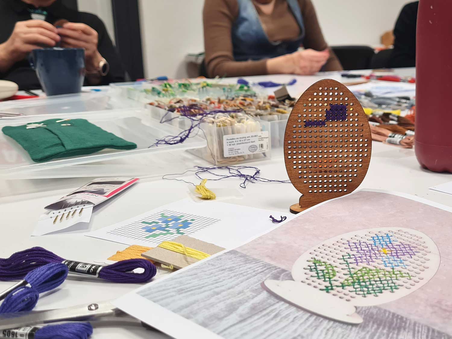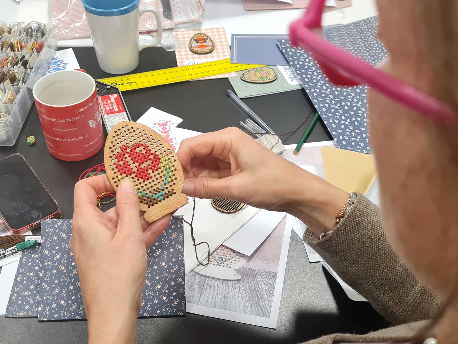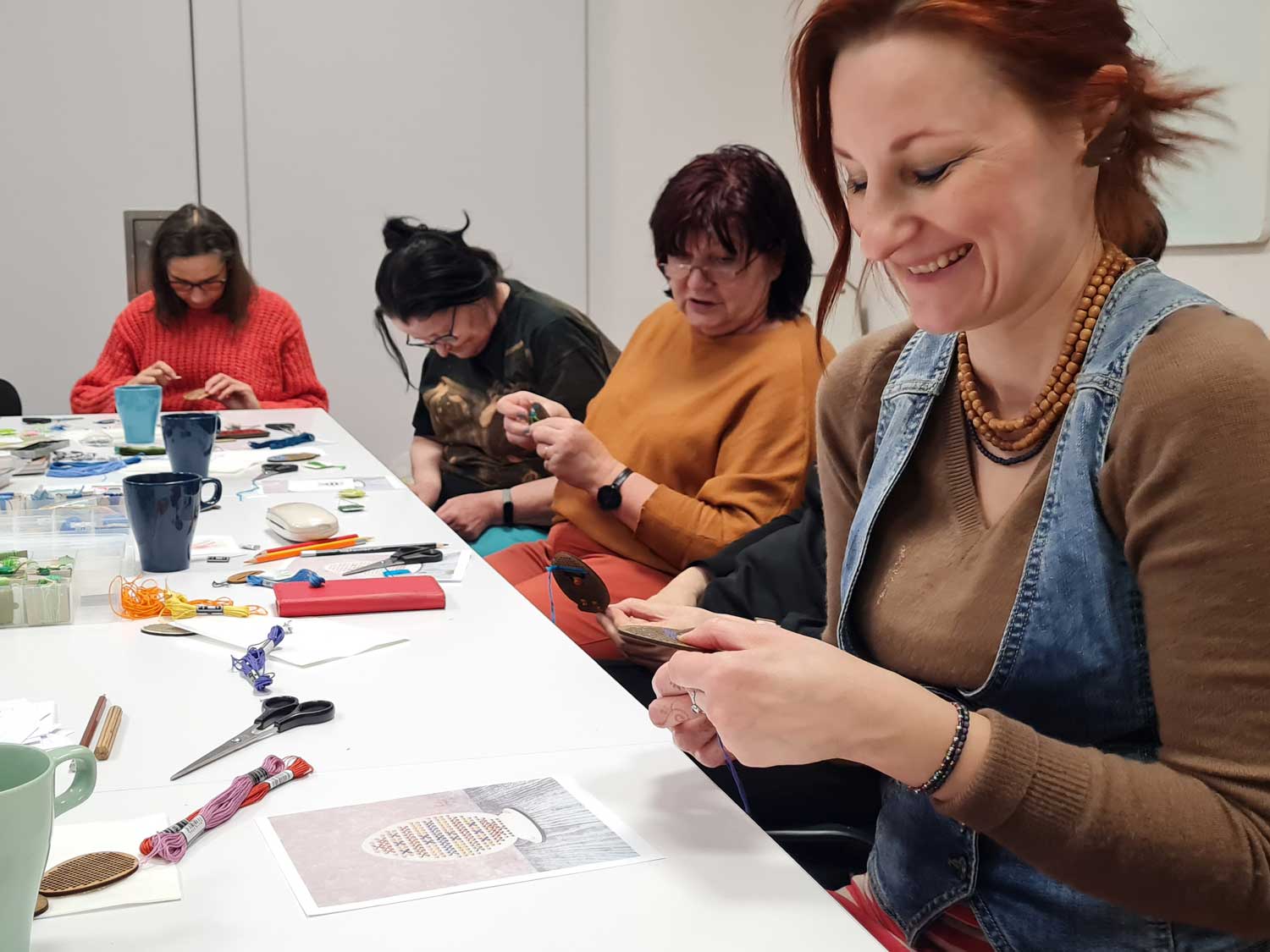 W poniedziałek 11 marca odbyły się kolejne warsztaty z cyklu 𝑷𝑰𝑺𝑨𝑵𝑲𝑨 𝓷𝓲𝓽𝓴ą 𝔃𝓭𝓸𝓫𝓲𝓸𝓷𝓪 – warsztaty opartych na różnych technikach rzemieślniczych. Poniedziałkowe popołudnie spędziłyśmy na wspólnym wyszywaniu drewnianych pisanek. Spotkanie rozpoczęło się od projektowania wzorów, by potem rozpocząć przyjemne wyszywanie 🙂 Miłym zaskoczeniem okazała się możliwość wykonania ozdobnej koperty i kartki świątecznej z wyszywaną pisanką! Niech kartki „lecą w Świat do bliskich” a nam pozostaną miłe wspomnienia z wczorajszego spotkania!