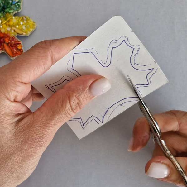 1.Wytnij haftowaną broszkę wzdłuż konturu tak, aby nie uszkodzić bajorka – na odległość około 2 mm. 2. Użyj lutownicy, aby zabezpieczyć krawędzie. 3. Odrysuj kształt broszki na kartonie. 4. Wykonaj dodatkowy obrys, cofając się o 2 mm do wewnątrz. 5. Wytnij mniejszy kształt.