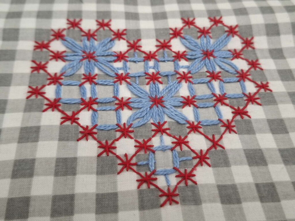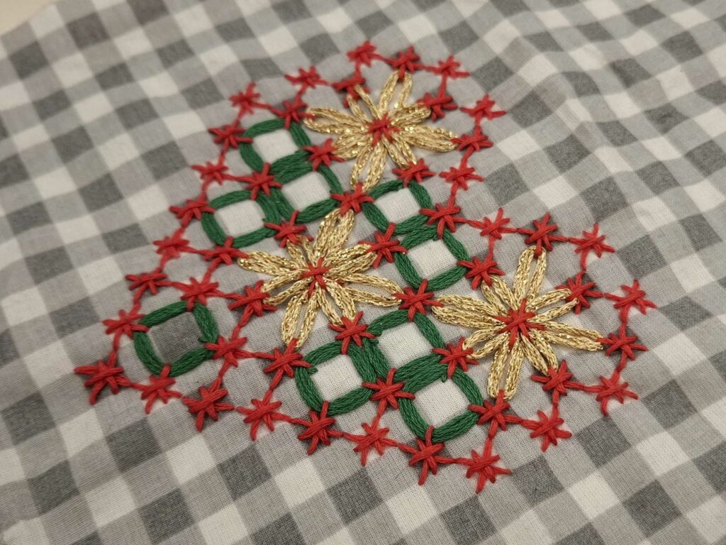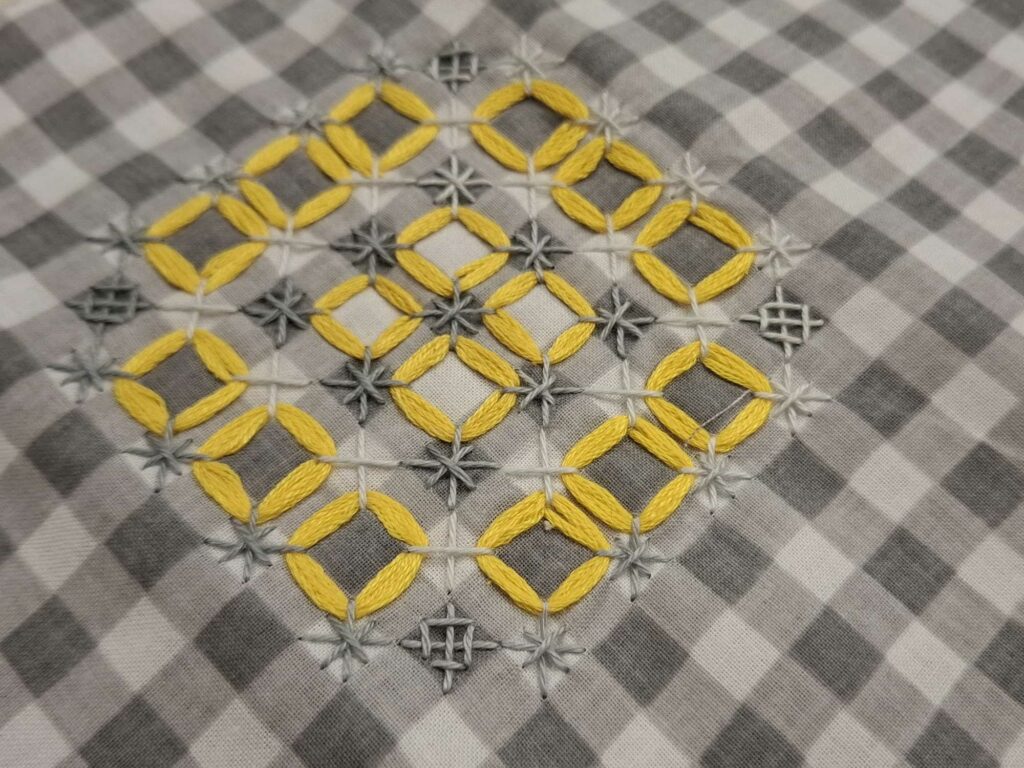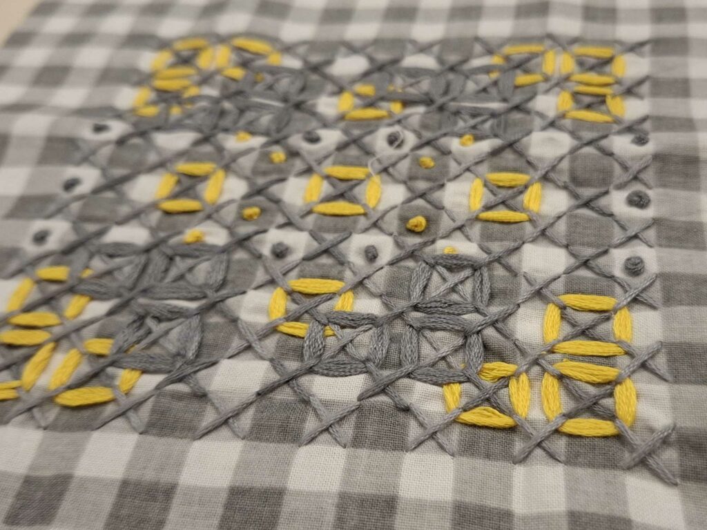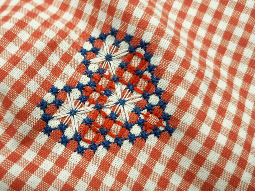 To technika, która łączy prostotę z niezwykłym efektem wizualnym: białe krzyżyki i geometryczne przeszycia tworzą na tkaninie subtelny, koronkowy wzór. Każdy haft nabiera niepowtarzalnego charakteru, a zwykła kratka zamienia się w tło dla misternych, ażurowych motywów.