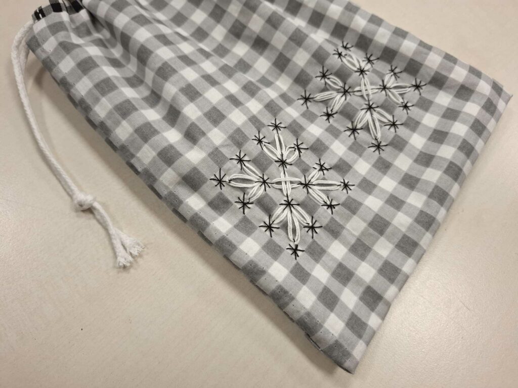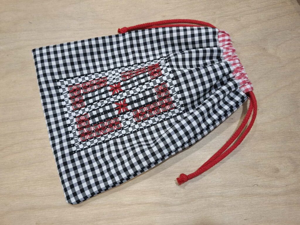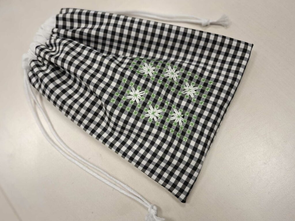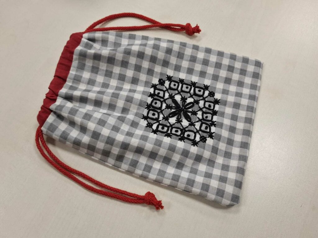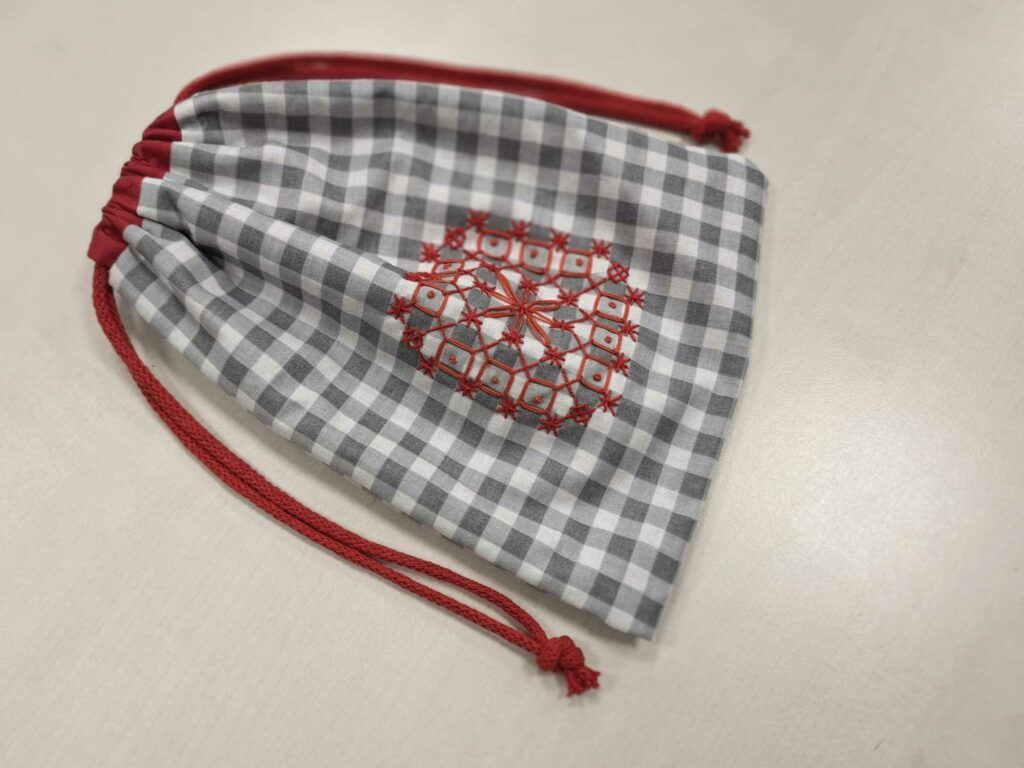Podsumowanie warsztatów – haftowany woreczek z tkaniny w kratkę