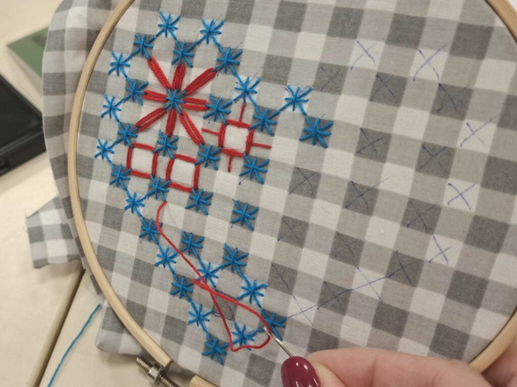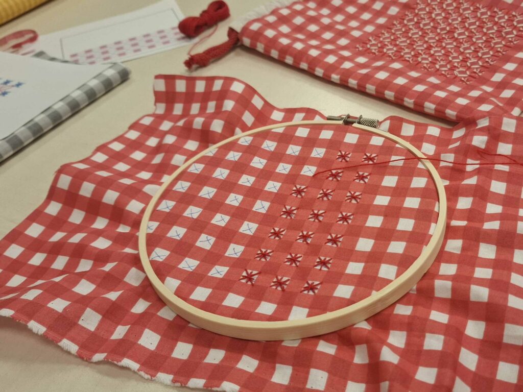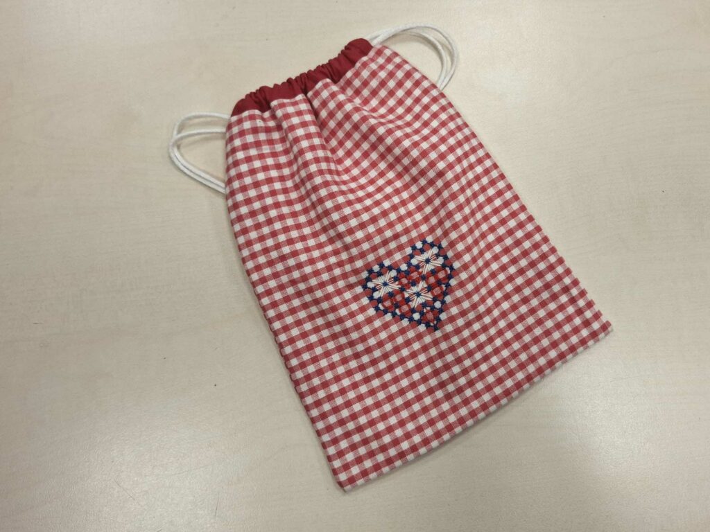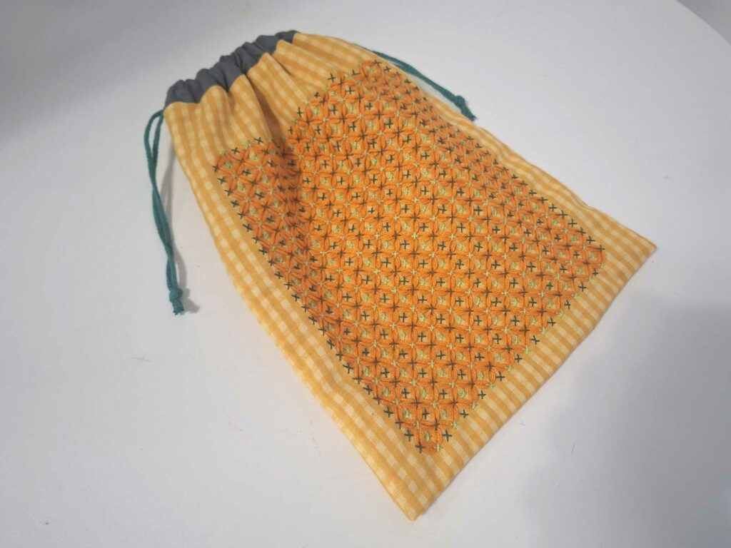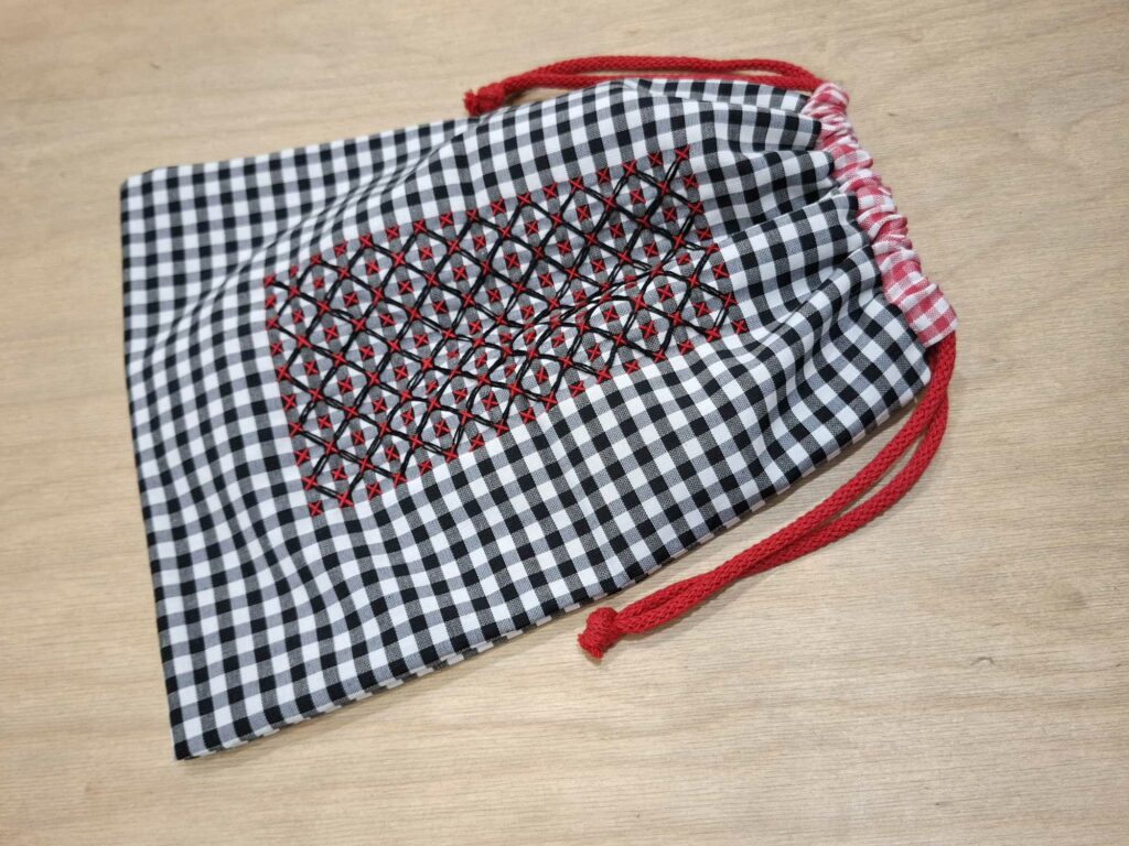 Podsumowanie warsztatów – haftowany woreczek z tkaniny w kratkę