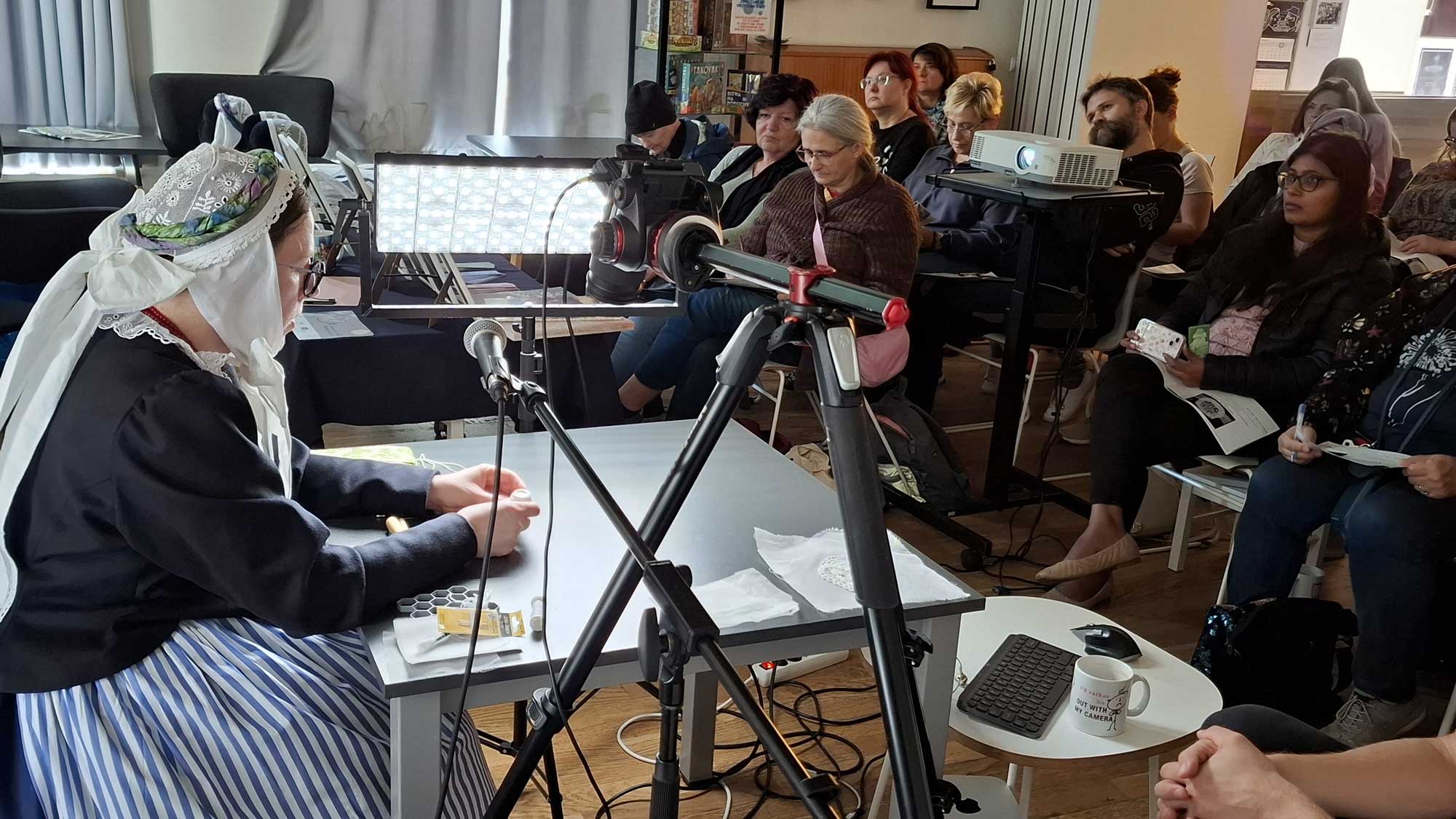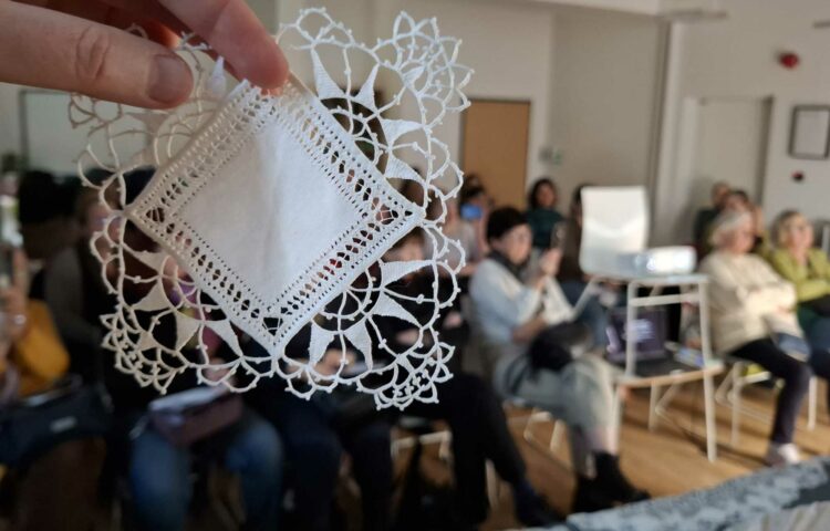 4 października 2025 roku mieliśmy przyjemność spotkać się z wyjątkową techniką – haftem na tiulu, który pozwala tworzyć delikatne, ażurowe koronki o niezwykłej subtelności i lekkości. Spotkanie poprowadziła Paulina Młynarczak (Wyszywoczka Paulina) – miłośniczka białego haftu i znawczyni haftu bamberskiego oraz szamotulskiego z Wielkopolski. Podczas wydarzenia uczestnicy poznali tajniki pracy z tiulem, dowiedzieli się, jak wyszywać oraz mieli okazję zobaczyć z bliska piękne przykłady koronek tworzonych tą techniką. Nie zabrakło też bezpłatnych konspektów z najważniejszymi informacjami o hafcie na tiulu oraz emocji podczas losowania zestawów startowych z bawełnianym tiulem, igłami i nićmi – idealnych do rozpoczęcia własnej przygody z tą sztuką.