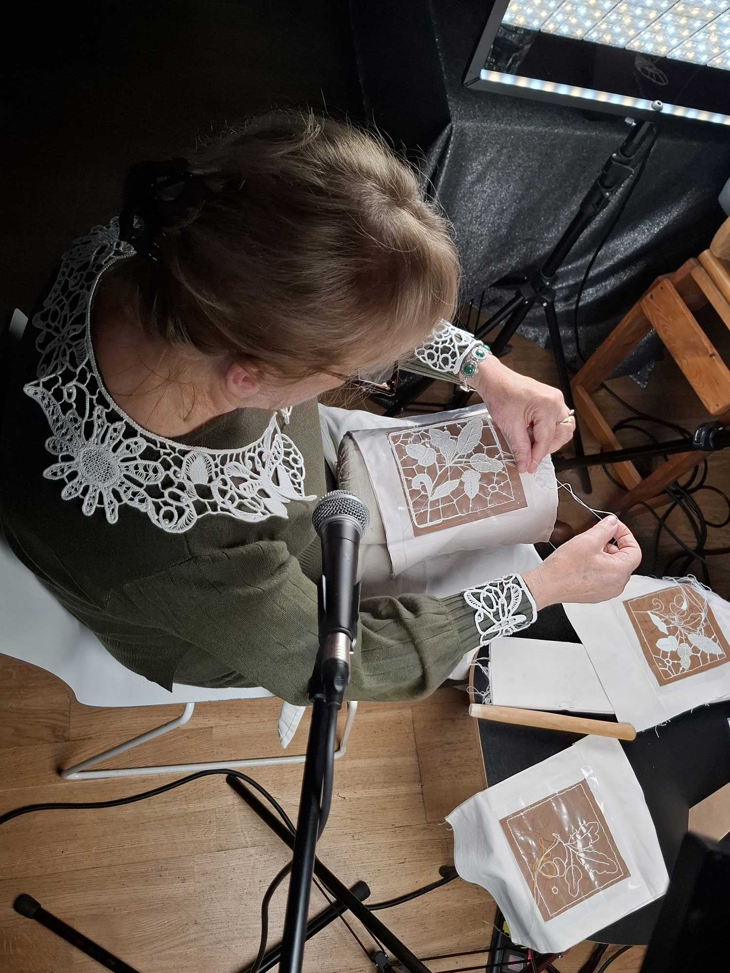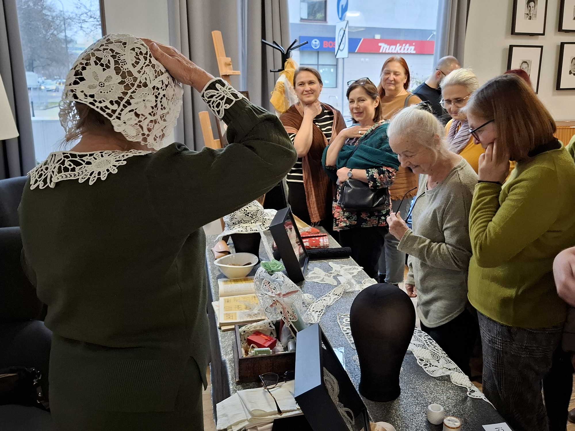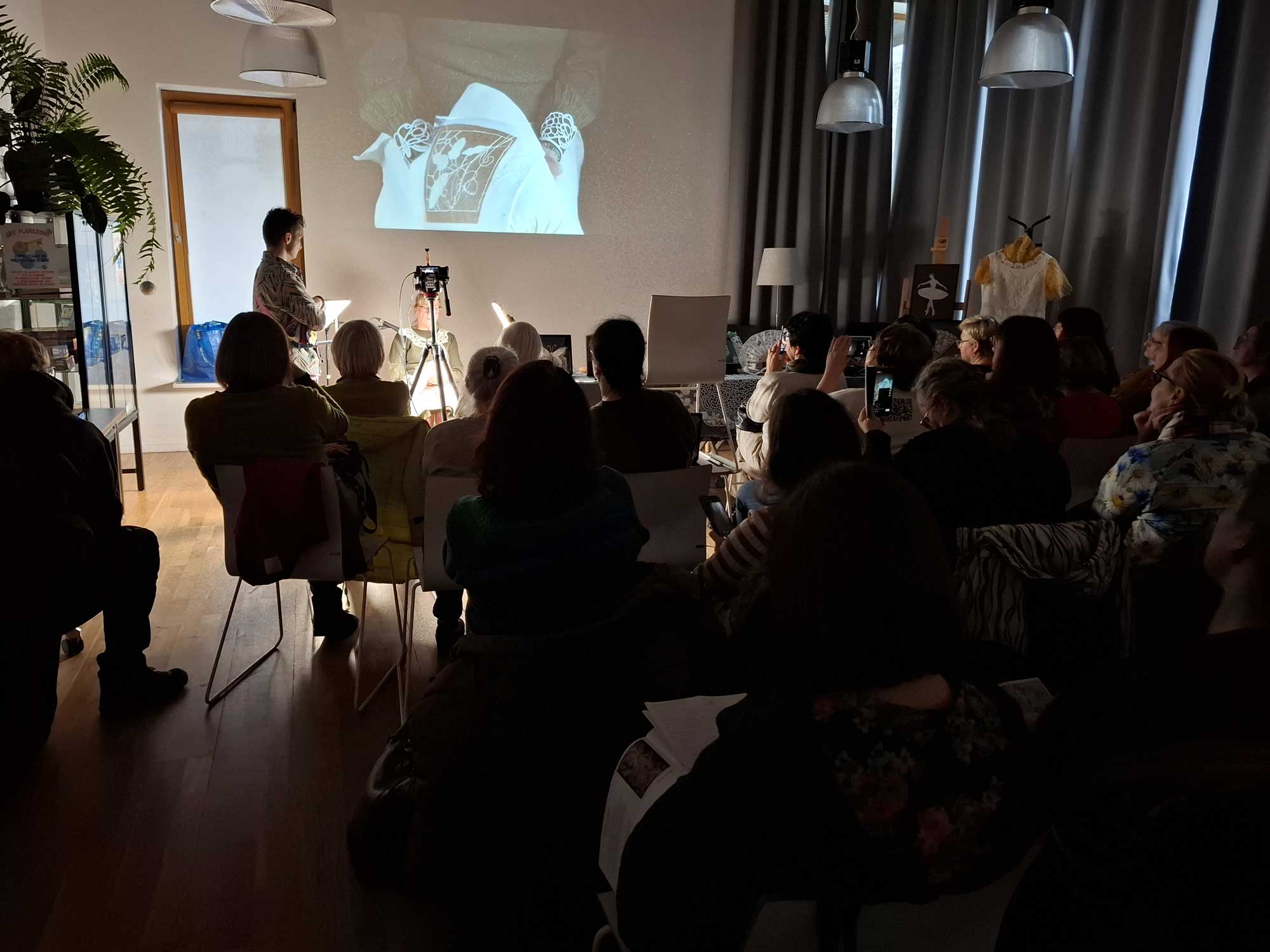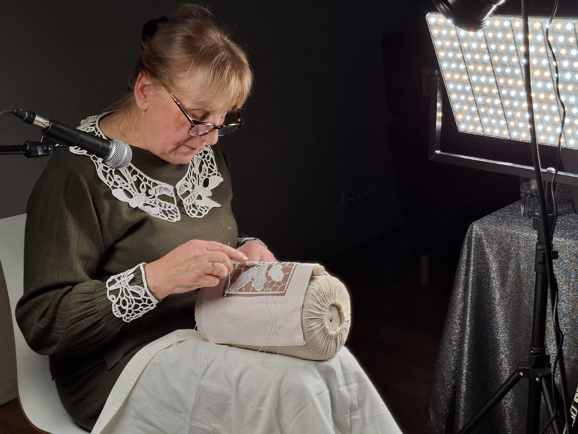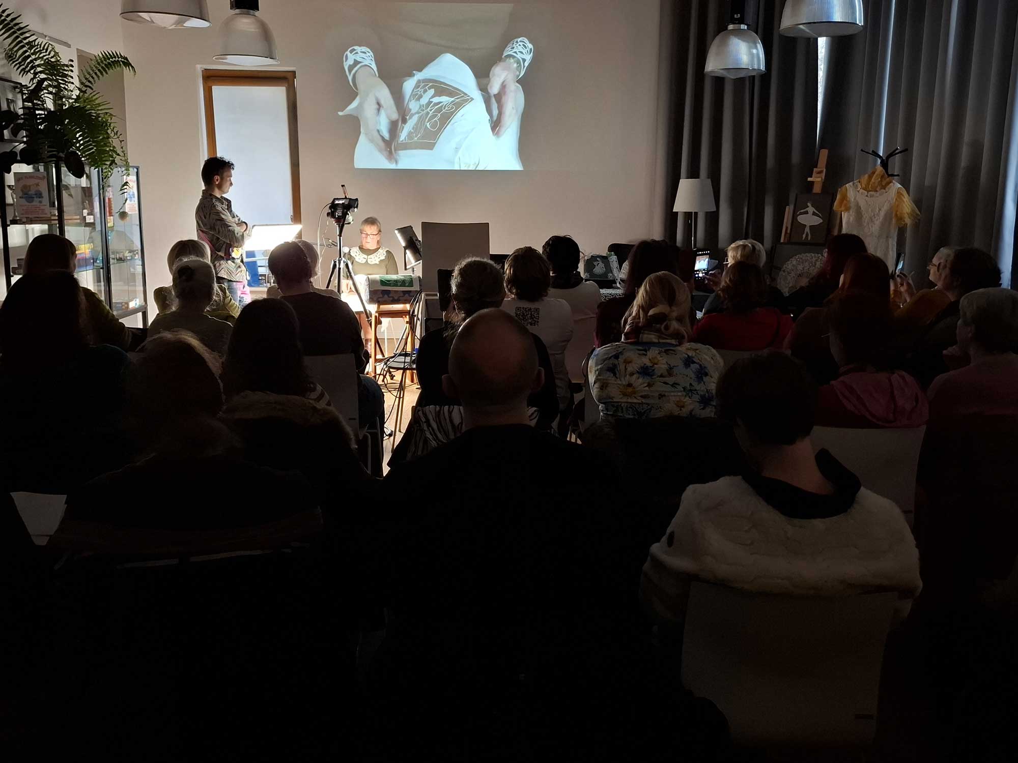 Koronkę igłową prezentowała Hanna Żak Nicpoń – doświadczona koronczarka, pasjonatka rękodzieła i laureatka wielu nagród. Podczas spotkania krok po kroku zaprezentowała proces powstawania koronki igłowej – od projektu, przez tworzenie konstrukcji, aż po wypełnianie wzoru. Uczestnicy mieli okazję zobaczyć prace z bliska, poznać narzędzia oraz zadać pytania dotyczące techniki i materiałów.