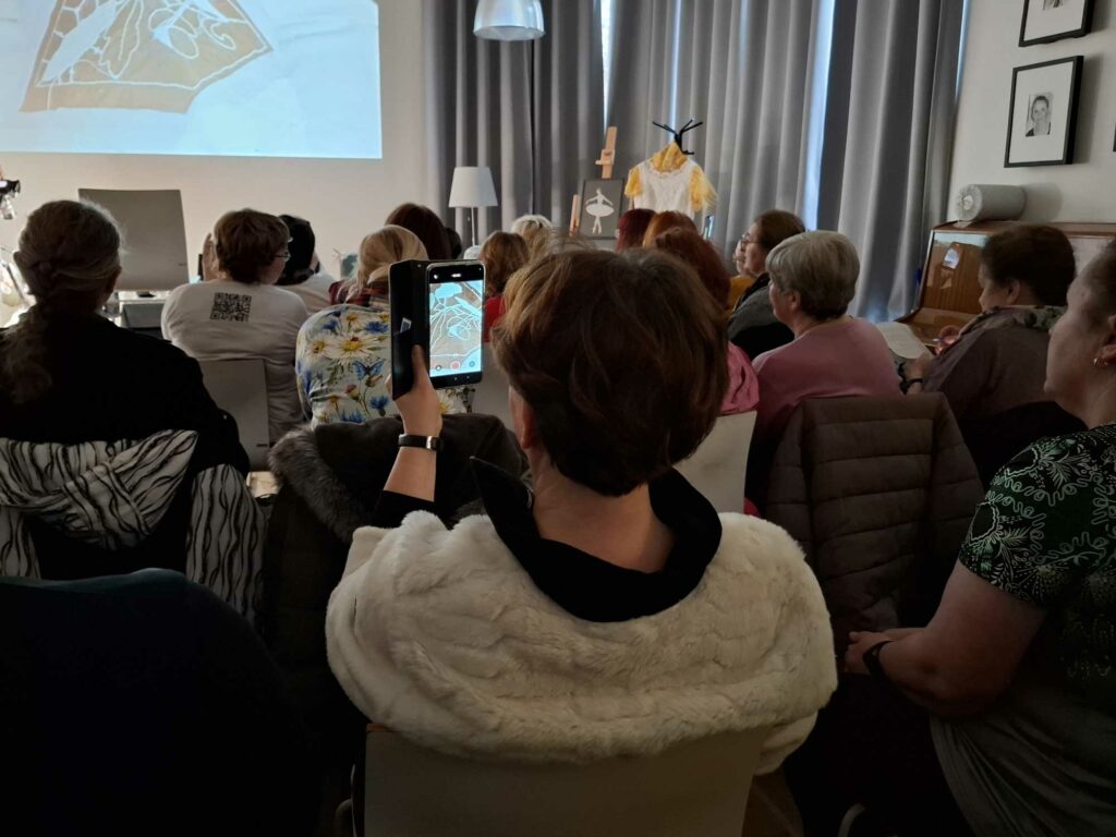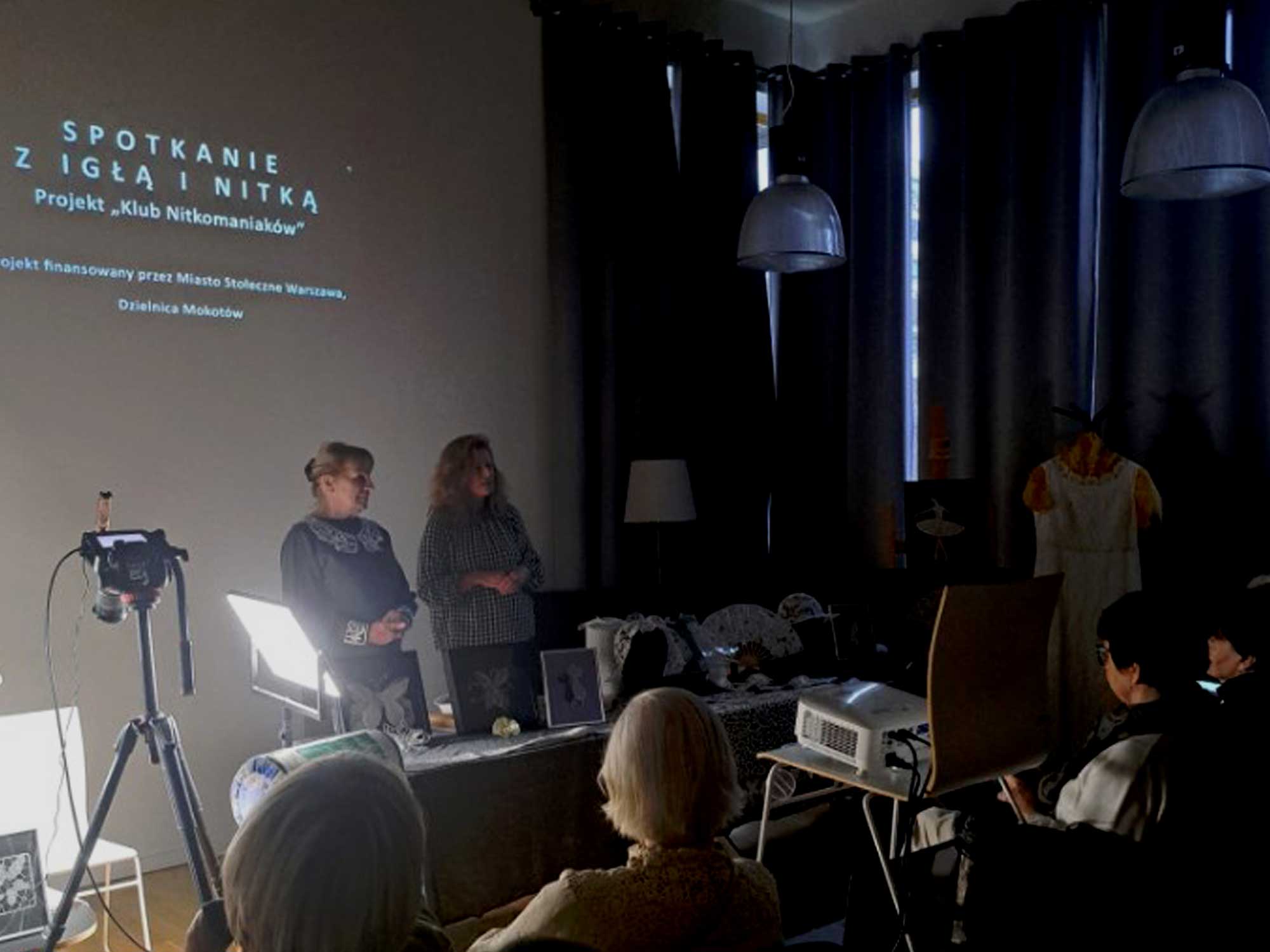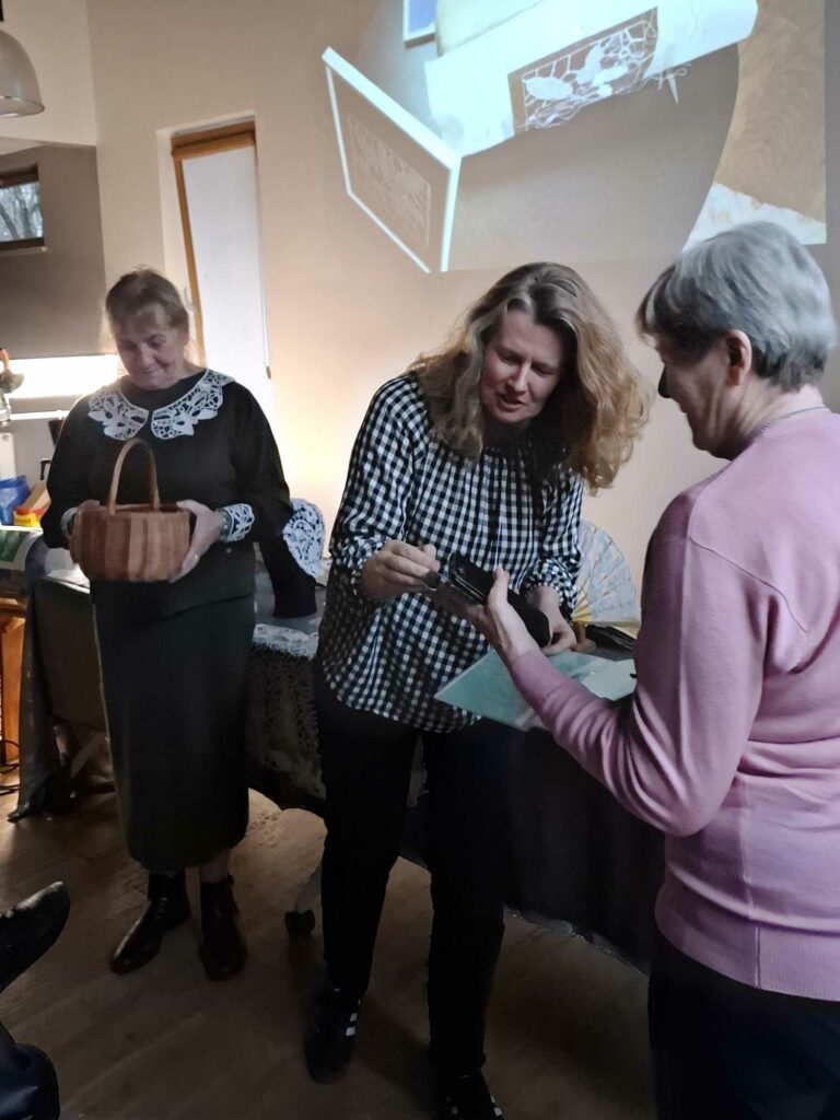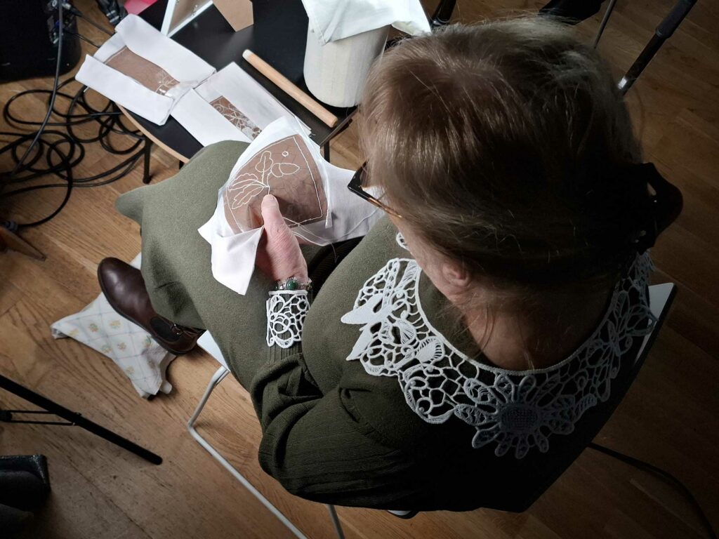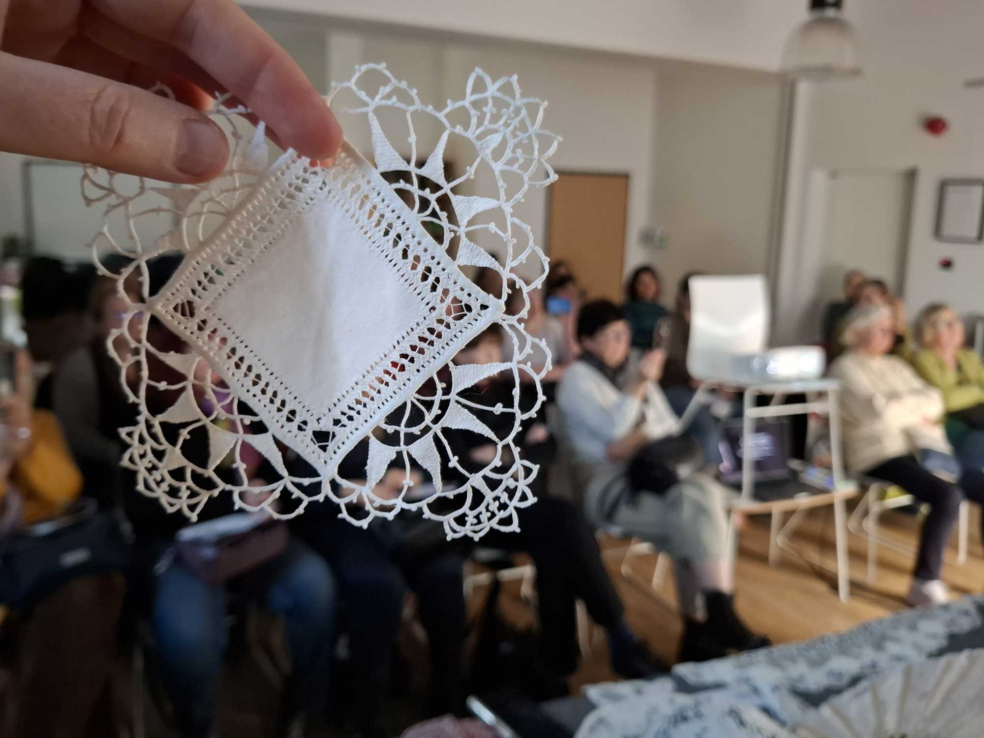 Koronkę igłową prezentowała Hanna Żak Nicpoń – doświadczona koronczarka, pasjonatka rękodzieła i laureatka wielu nagród. Podczas spotkania krok po kroku zaprezentowała proces powstawania koronki igłowej – od projektu, przez tworzenie konstrukcji, aż po wypełnianie wzoru. Uczestnicy mieli okazję zobaczyć prace z bliska, poznać narzędzia oraz zadać pytania dotyczące techniki i materiałów.