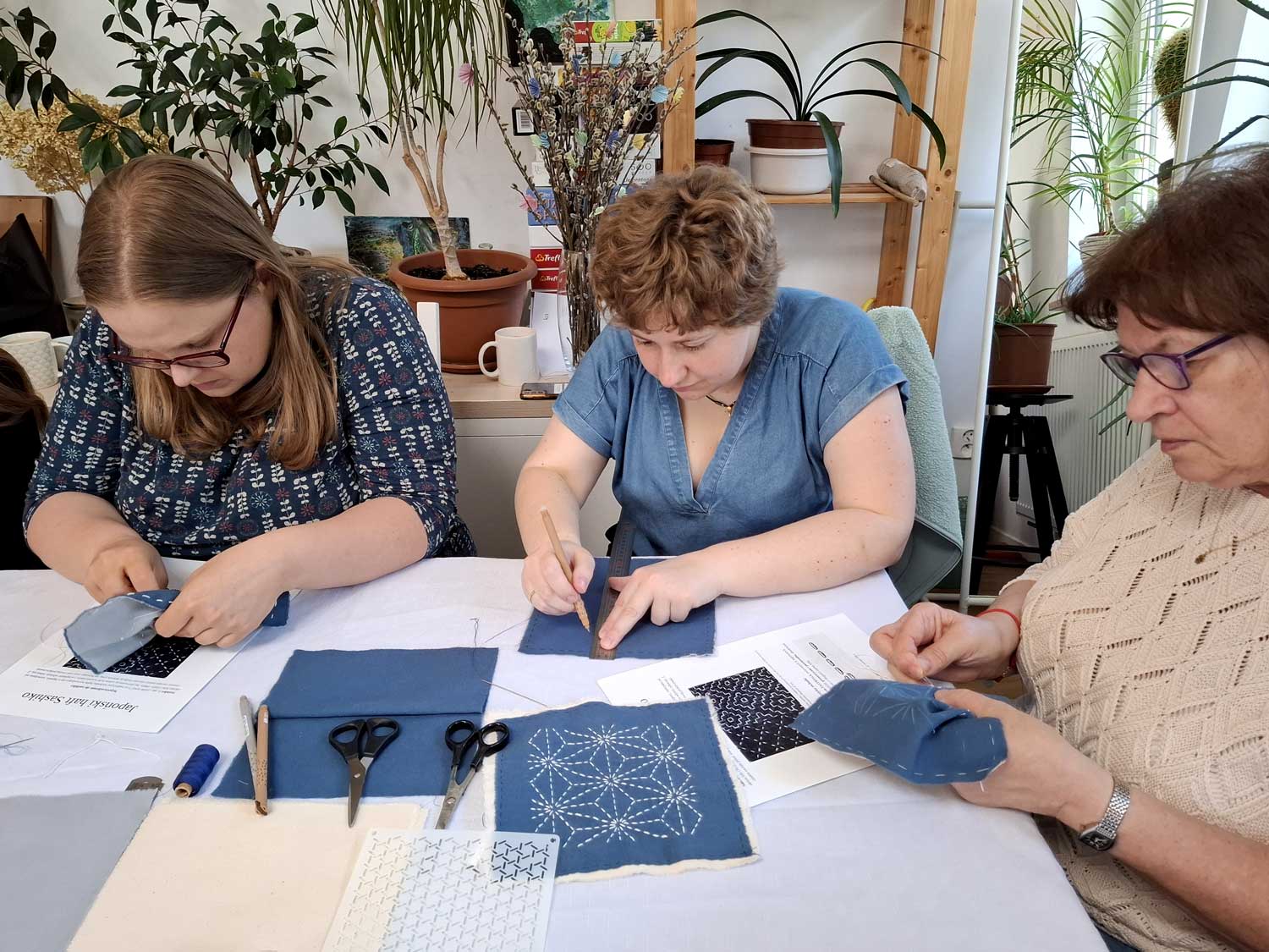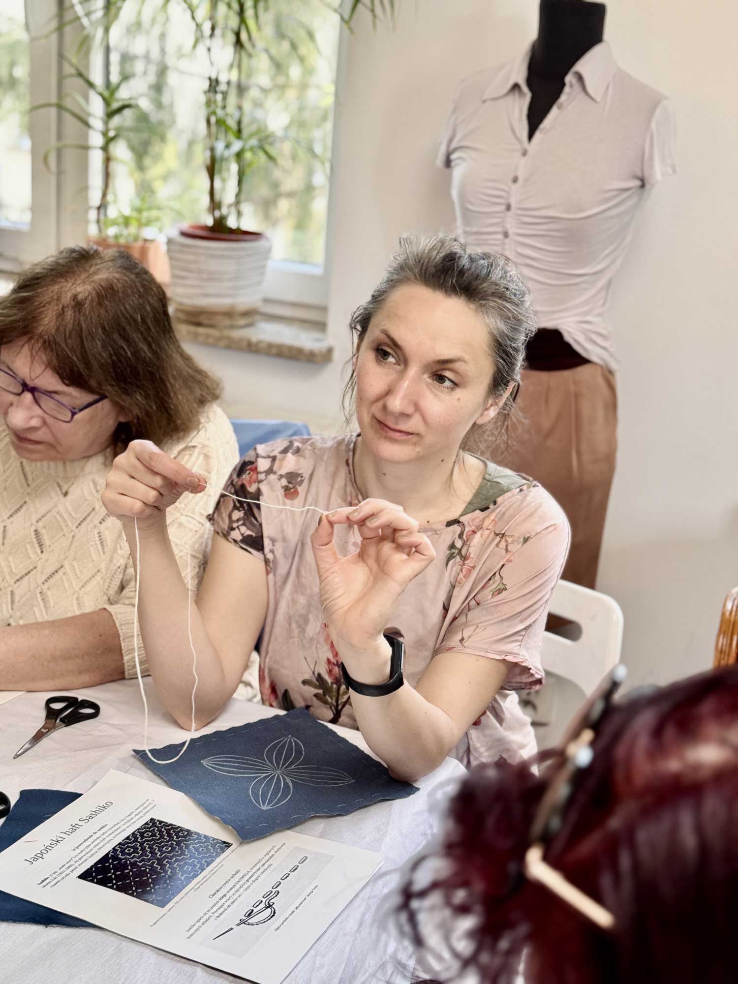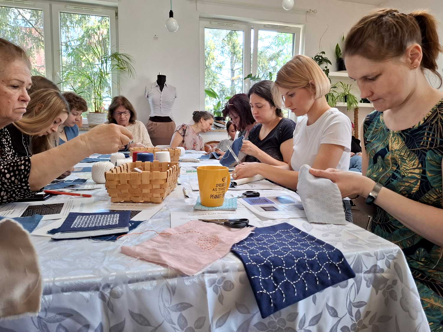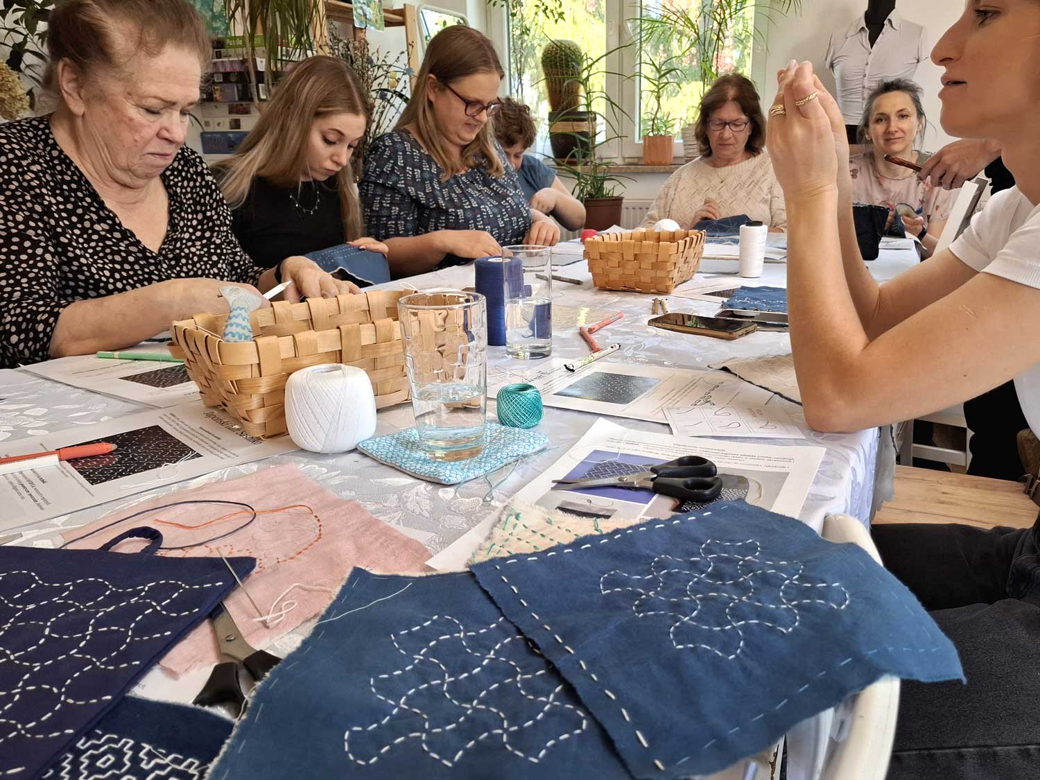 W sobotę 26 kwietnia odbyły się kolejne warsztaty w ramach projektu „Nici z herbatki”, podczas których poznawaliśmy tajniki japońskiego haftu sashiko. Liczna grupa kobiet z wielkim zaangażowaniem chwyciła za długie igły i inspirując się tradycyjnymi wzorami, tworzyła swoje pierwsze prace. Najczęściej wybierano klasyczną, granatową tkaninę i białe bawełniane nici, a w twórczej i serdecznej atmosferze powstało wiele pięknych, różnorodnych dzieł.