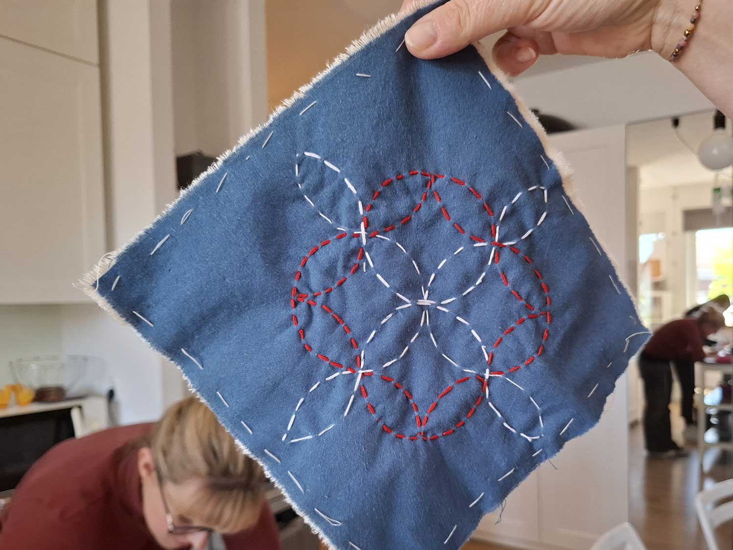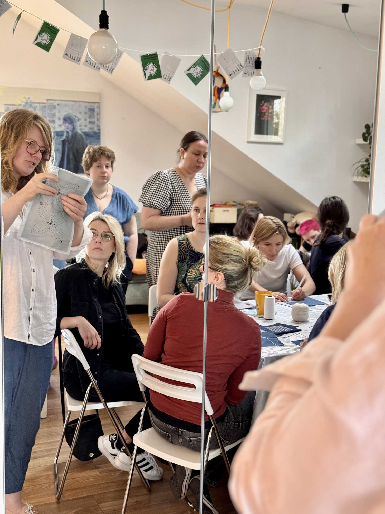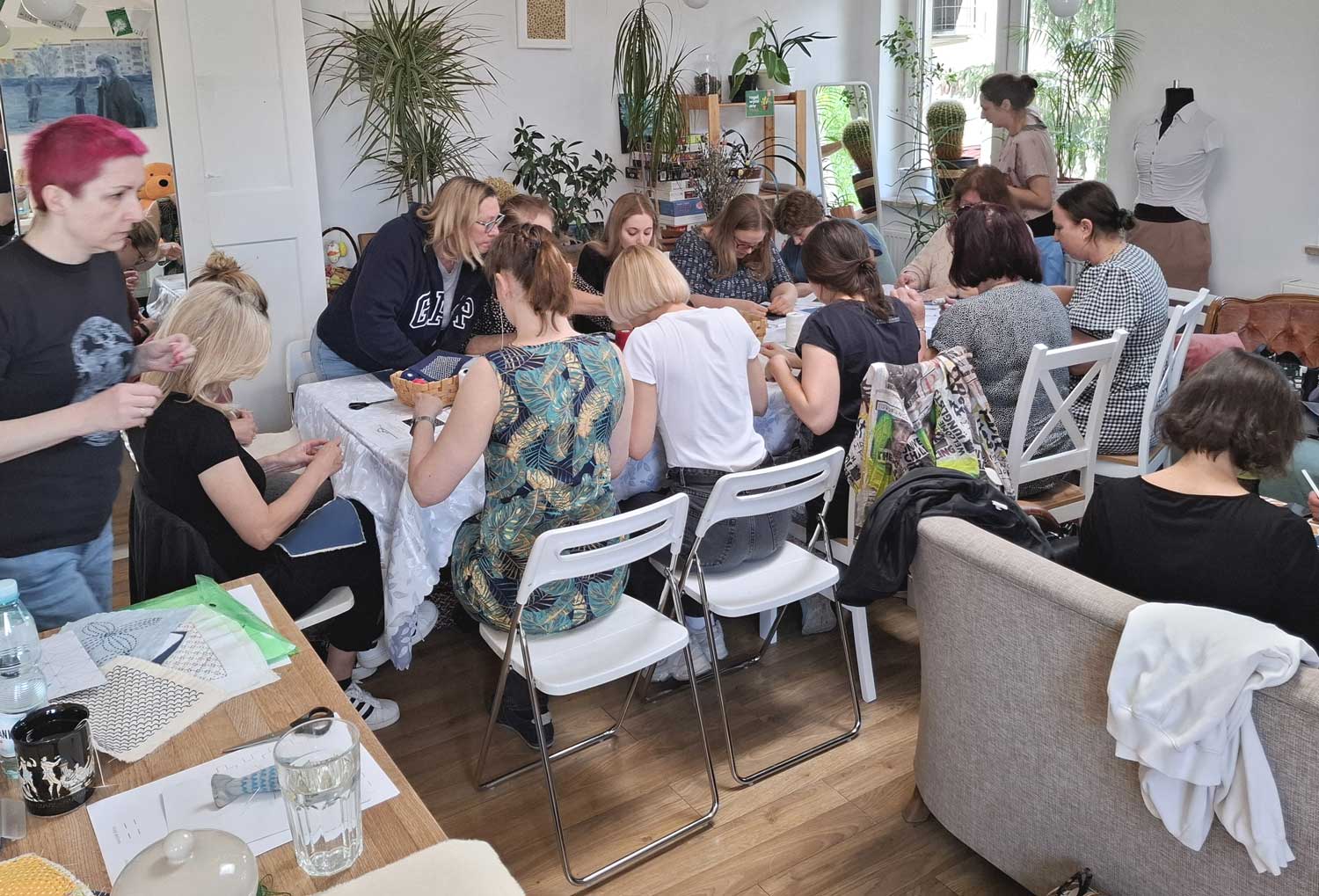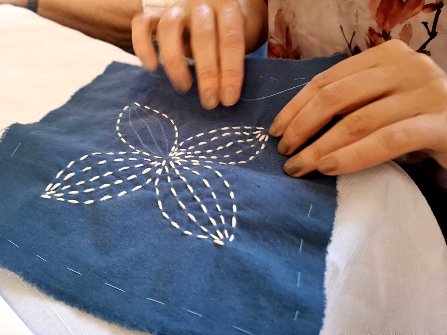 W sobotę 26 kwietnia odbyły się kolejne warsztaty w ramach projektu „Nici z herbatki”, podczas których poznawaliśmy tajniki japońskiego haftu sashiko. Liczna grupa kobiet z wielkim zaangażowaniem chwyciła za długie igły i inspirując się tradycyjnymi wzorami, tworzyła swoje pierwsze prace. Najczęściej wybierano klasyczną, granatową tkaninę i białe bawełniane nici, a w twórczej i serdecznej atmosferze powstało wiele pięknych, różnorodnych dzieł.