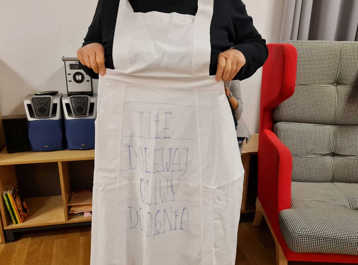 Ostatnie warsztaty haftu poświęciliśmy na tworzenie „łapek do kuchni” chroniących przed gorącymi garnkami. Wykorzystaliśmy starą bieliznę pościelową [tkaninę z poduszek, prześcieradeł] i inspirując się tradycyjnymi makatkami kuchennymi stworzyliśmy akcesoria kuchenne z napisami: „ciepło, zimno, gorąco”, „łap chwile”, „chwytaj dzień”.