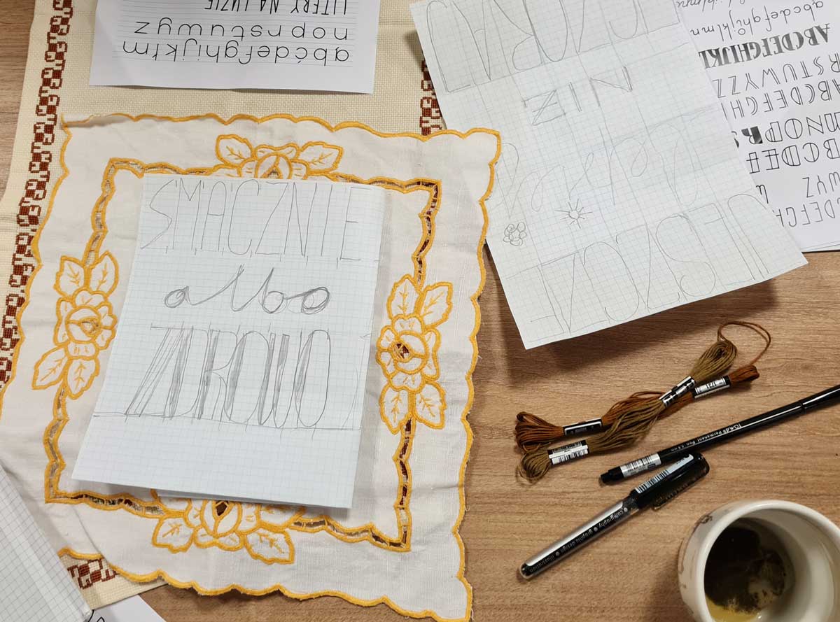 Nasze „gadanie” rozpoczęliśmy od projektowania wzorów, które w kolejnym kroku wyszywaliśmy ręcznie na kuchennych tekstyliach.
