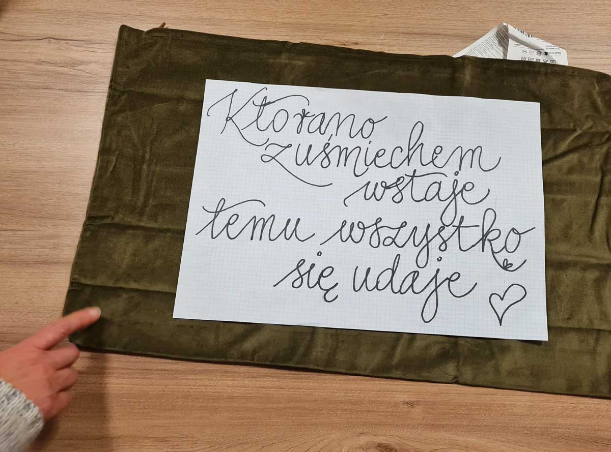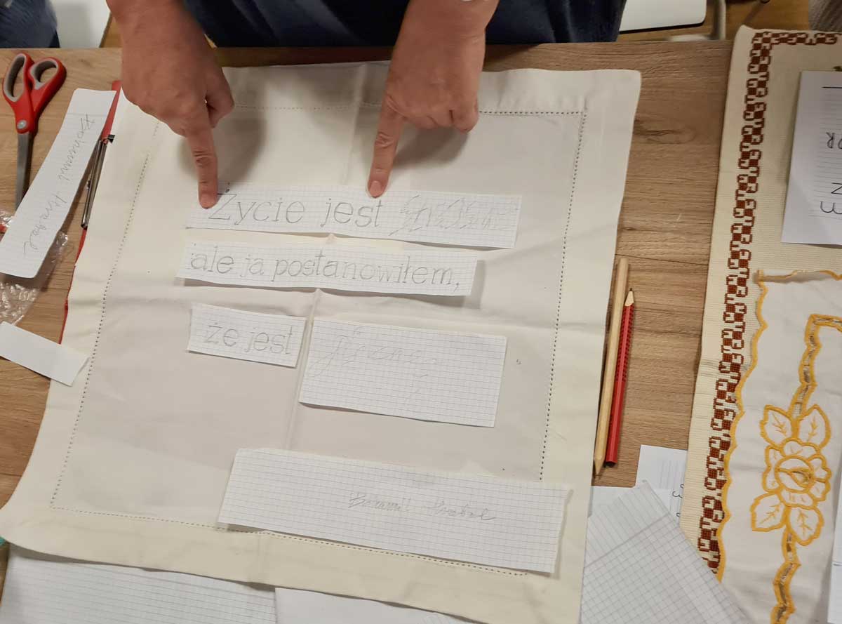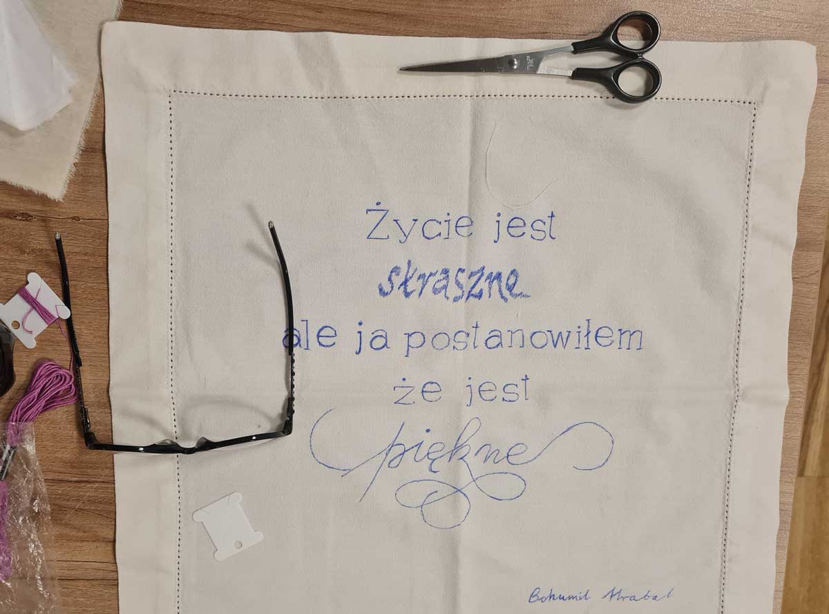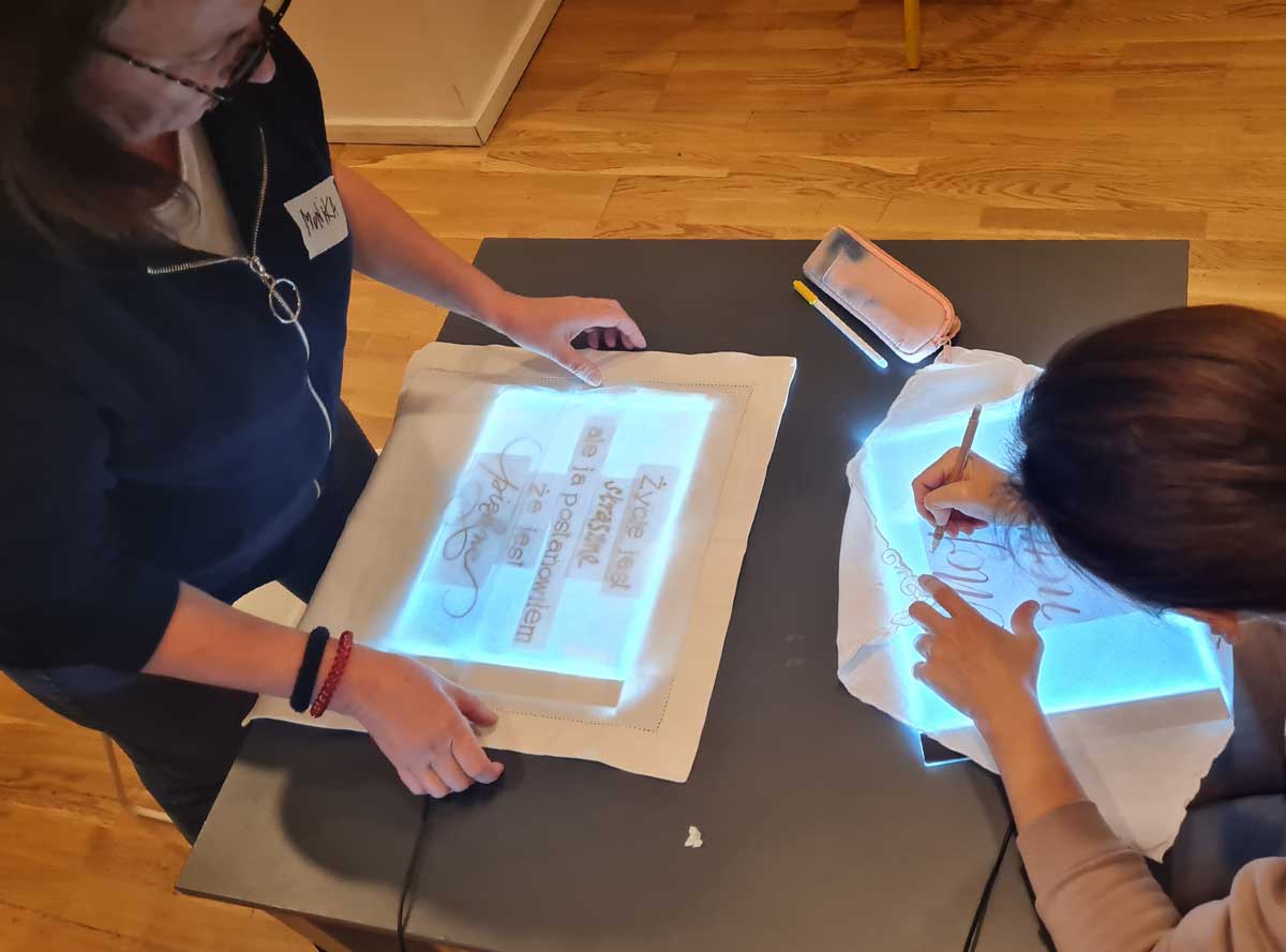 Warsztaty kaligrafii prowadziła doświadczona w projektowaniu wzorów makatek kuchennych Barbara Galińska [Barbara Galinska kaligrafia]. Przygotowane wzorniki różnych krojów liter stanowiły punkt wyjścia do projektów. Każdy wybrał styl odpowiedni do słów, które będzie wyszywał.