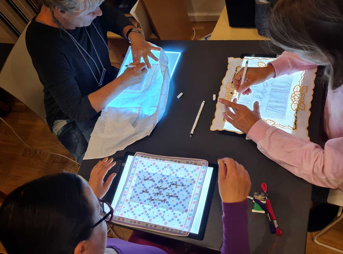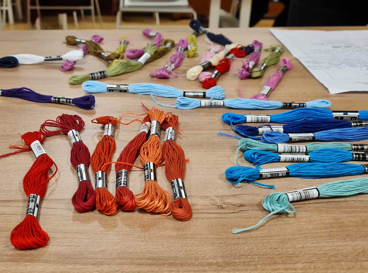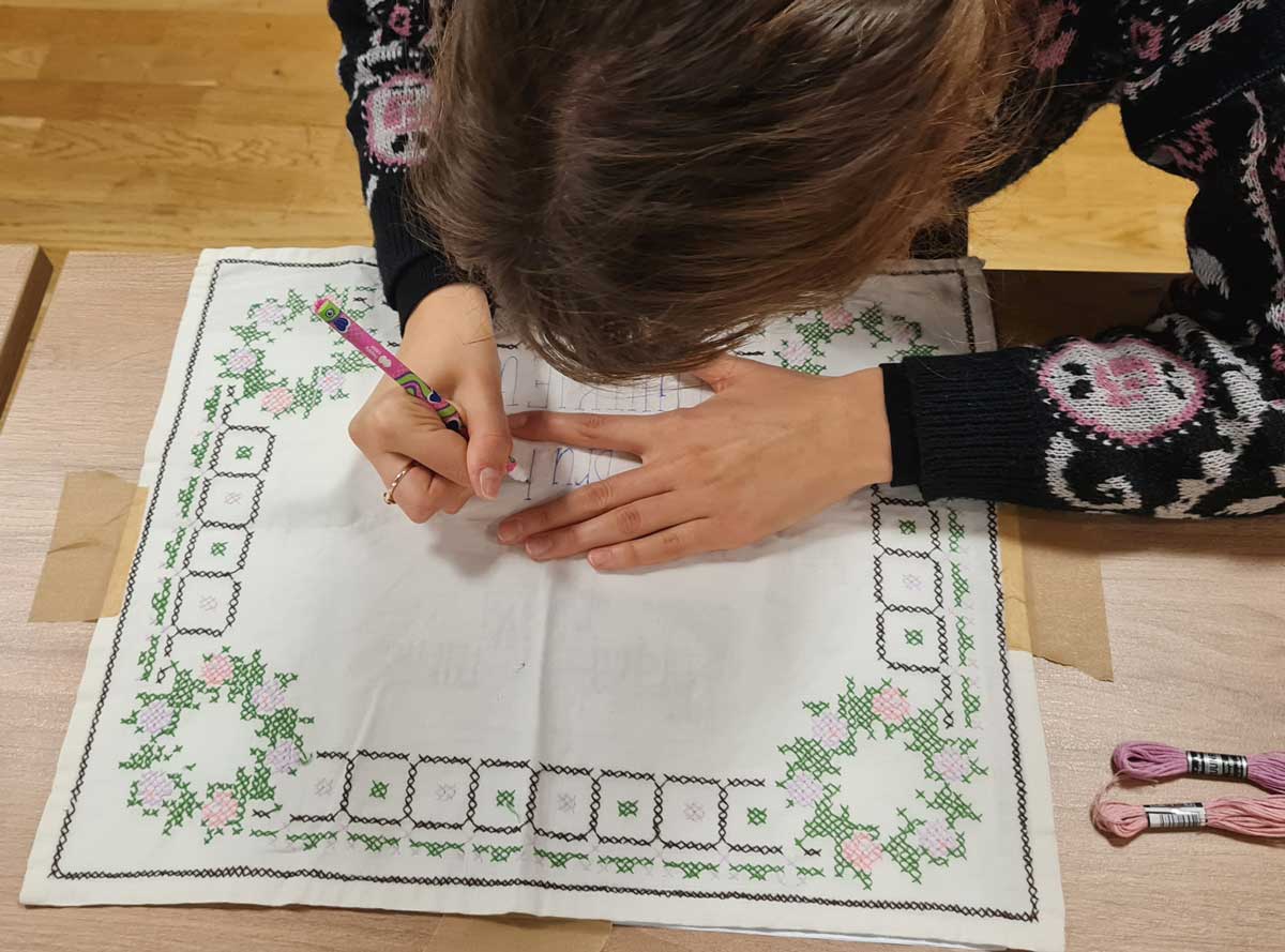 Warsztaty haftu rozpoczęliśmy od przenoszenia wzorów na wybrane akcesoria. W projekcie pracowaliśmy na starych serwetkach, ściereczkach, fartuszkach. Zależało nam, by dać „drugie życie” zapomnianym szmatkom. Wzory przenosiliśmy wykorzystując podświetlane tablice kreślarskie. Kolejnym krokiem był wybór odpowiedniego koloru nici do wyszywania, by ostatecznie rozsiąść się wygodnie na krześle lub w fotelu i wyszywać.