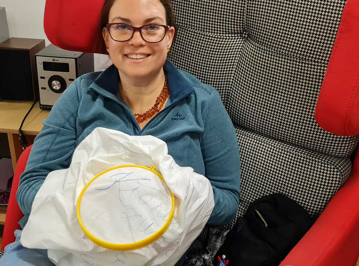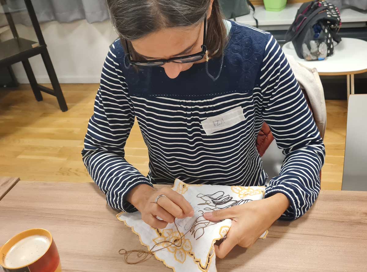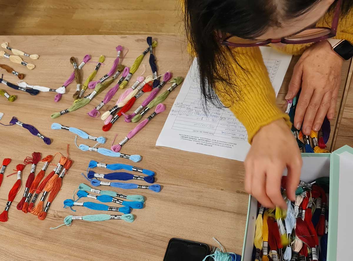 Warsztaty haftu rozpoczęliśmy od przenoszenia wzorów na wybrane akcesoria. W projekcie pracowaliśmy na starych serwetkach, ściereczkach, fartuszkach. Zależało nam, by dać „drugie życie” zapomnianym szmatkom. Wzory przenosiliśmy wykorzystując podświetlane tablice kreślarskie. Kolejnym krokiem był wybór odpowiedniego koloru nici do wyszywania, by ostatecznie rozsiąść się wygodnie na krześle lub w fotelu i wyszywać.