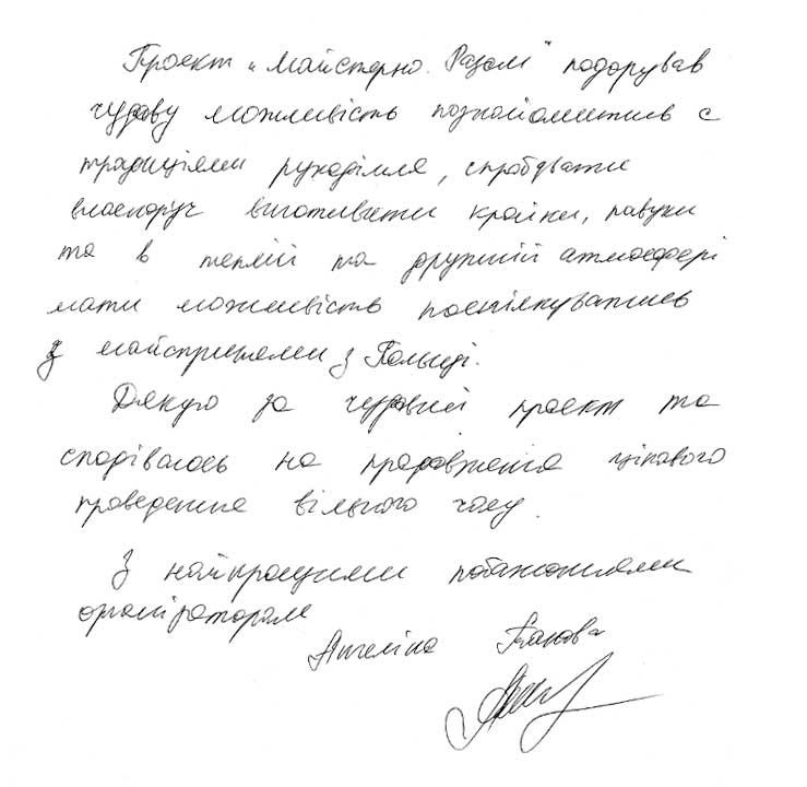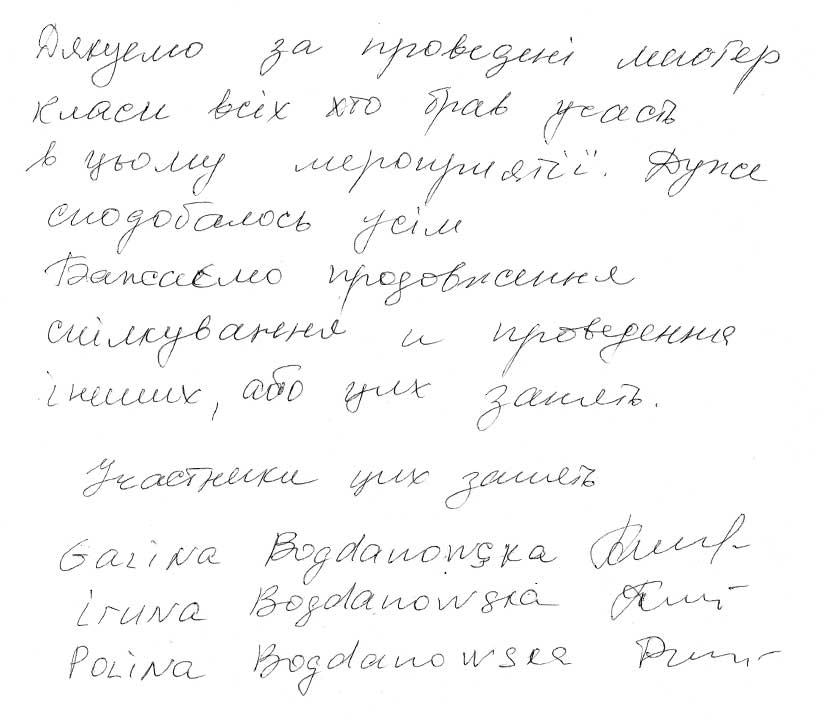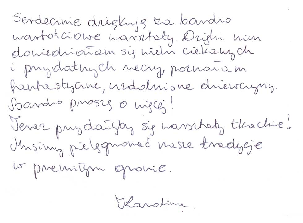 Щиро дякую за надзвичайно придатні майстер-класи. Завдяки їм я дізналася про багато цікавих та корисних речей, познайомилася з неймовірно обдарованими дівчатами. Прохання — більше таких зустрічей! Пропоную організувати майстер-класи з ткацтва. Треба плекати наші традиції в такому чудовому товаристві. Кароліна
