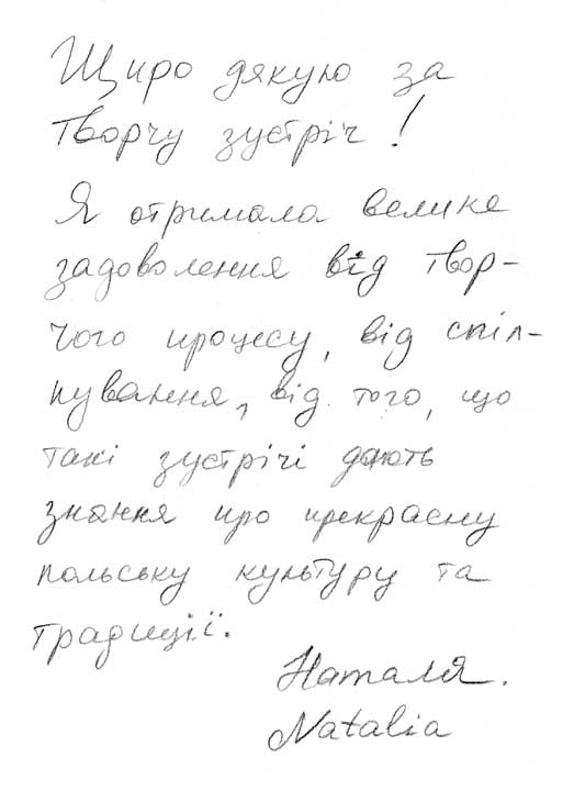 Щиро дякую за творчу зустріч! Я отримала велике задоволення від процесу, спілкування та нових знань про прекрасну польську культуру. Наталя